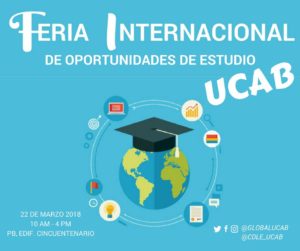 La Feria Internacional de Oportunidades de Estudio UCAB vuelve el próximo 22 de marzo, de la mano del Secretariado de Internacionalización de la universidad. La actividad se realizará en la PB del edificio Cincuentenario, en el campus de Montalbán, de 10 de la mañana a 4 de la tarde, y tiene por objetivo brindar herramientas e información a estudiantes, docentes e investigadores que deseen realizar intercambios académicos fuera de Venezuela.