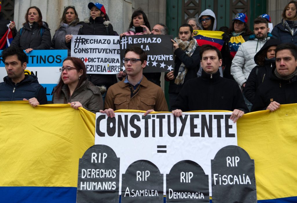 Members of the Venezuelan community in Argentina protest against the election for a "Constituent Assembly", in Buenos Aires on July 30, 2017 as Venezuela holds A controversial vote in Venezuela championed by beleaguered President Nicolas Maduro sparked an escalation of deadly violence, with half a dozen people reported killed and troops and protesters attacking each other in Caracas and elsewhere. / AFP / ALEJANDRO PAGNI