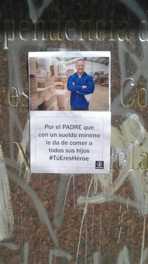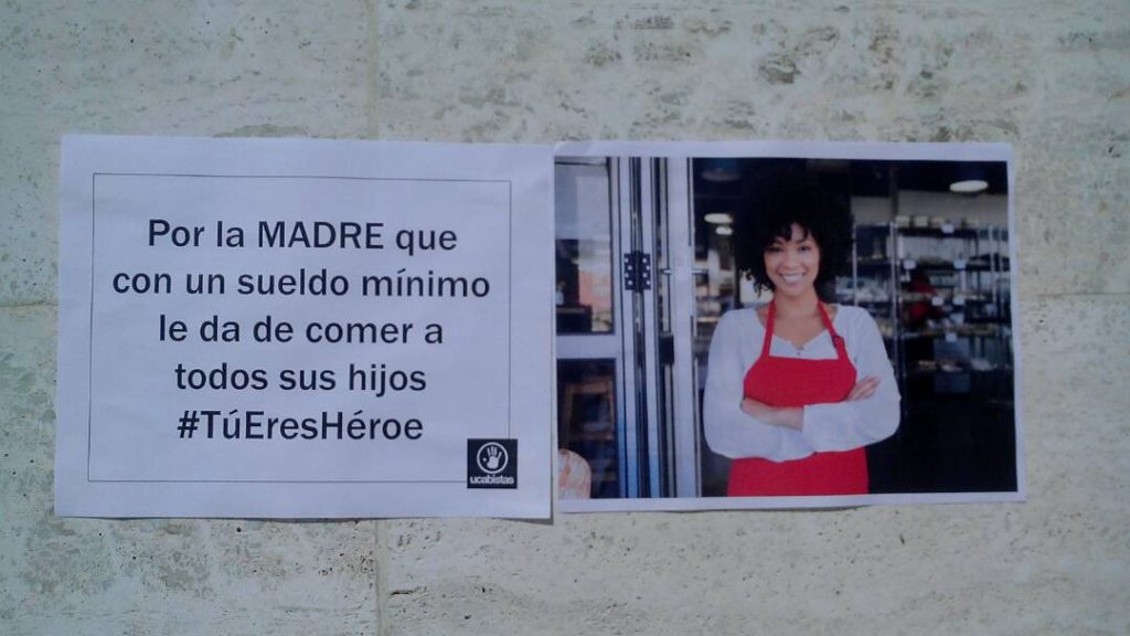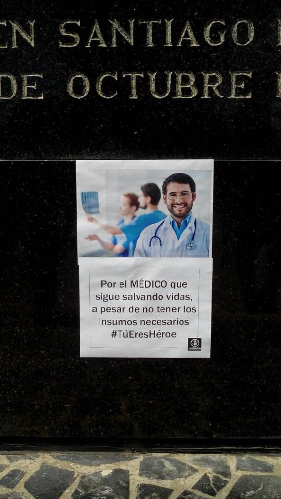 Carteles con frases como «Por el abuelo que con la pensión logra sobrevivir a la crisis de alimentos y medicinas», «Por la madre que con sueldo mínimo le da de comer a todos sus hijos» o «Por el panadero que sigue produciendo pan a pesar de la escasez» pueden verse desde hace varios días en sitios como la cabina de un funicular del teleférico, la baranda de un mirador, el busto de Andrés Bello en Plaza Venezuela o al pie de la estatua de algún prócer militar como José Antonio Páez.