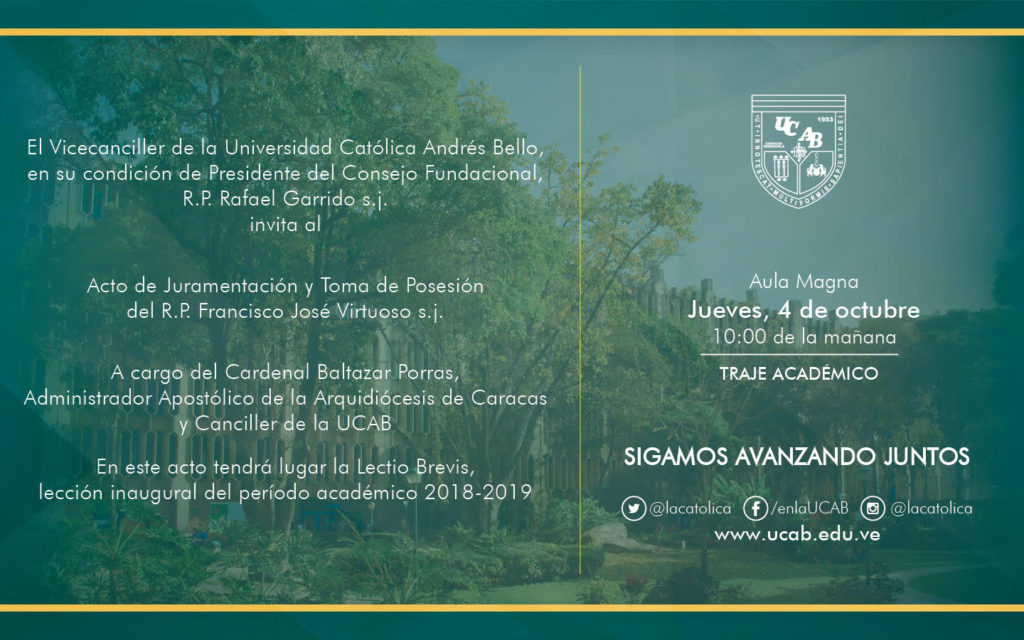 La juramentación estará a cargo del cardenal Baltazar Porras, administrador apostólico del Arzobispado de Caracas y vicecanciller de la UCAB, quien será acompañado por el sacerdote Rafael Garrido, superior provincial de los jesuitas en Venezuela y presidente del Consejo Fundacional.