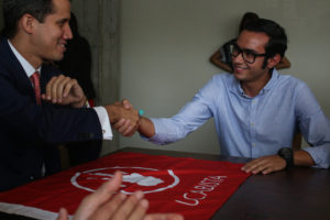 Durante la reunión, los dirigentes obsequiaron a Guaidó una bandera del Movimiento Estudiantil de la UCAB como símbolo de apoyo y acompañamiento. La entrega la realizó el Consejero de Desarrollo Estudiantil, Roberto Rodrigues.