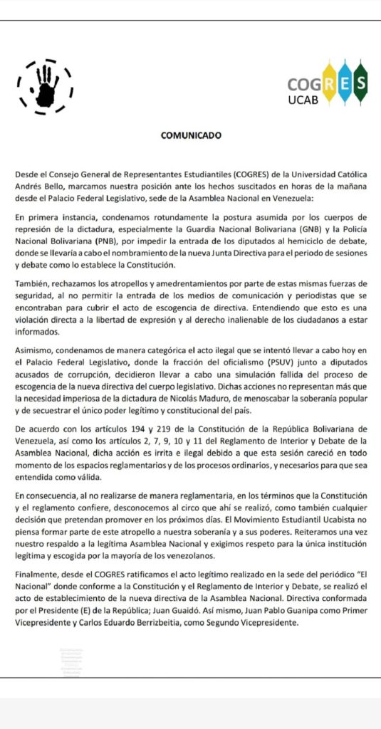 El COGRES UCAB emitió el día 6 de enero un comunicado oficial en el que dejó claro que esta organización de estudiantes rechaza la designación de Luis Parra como presidente de la Asamblea Nacional y reitera su apoyo a la gestión de Juan Guaidó como líder del Parlamento y presidente encargado del país.