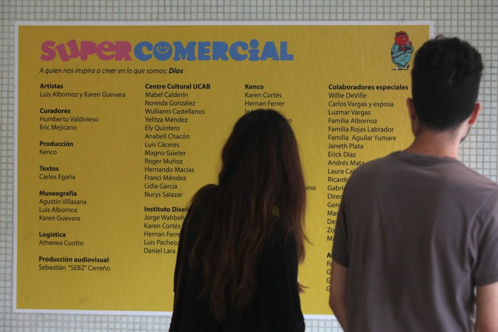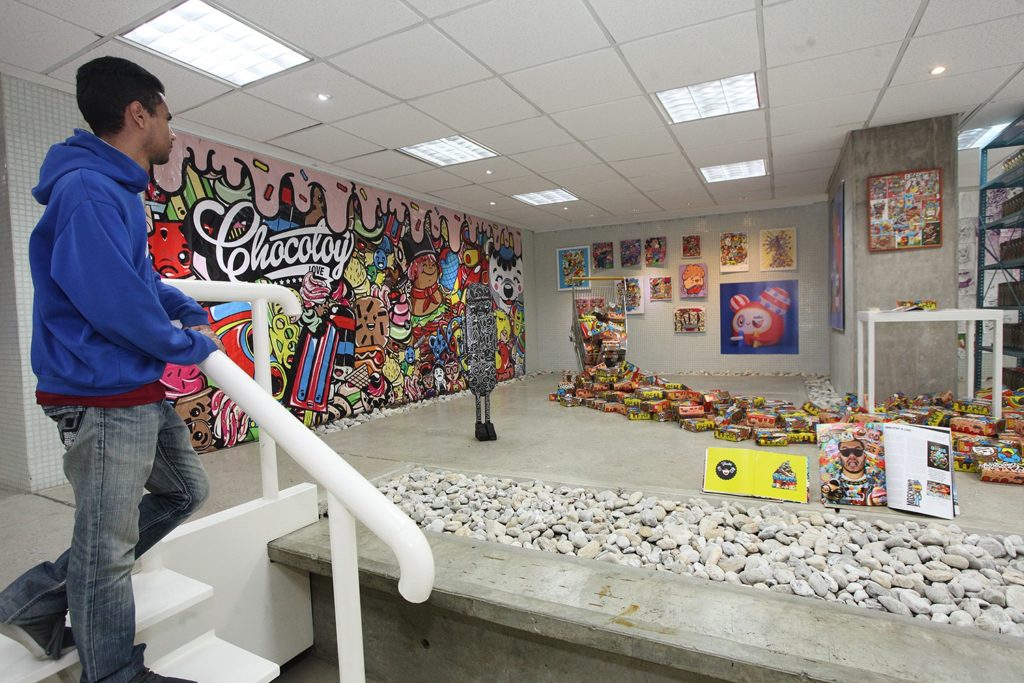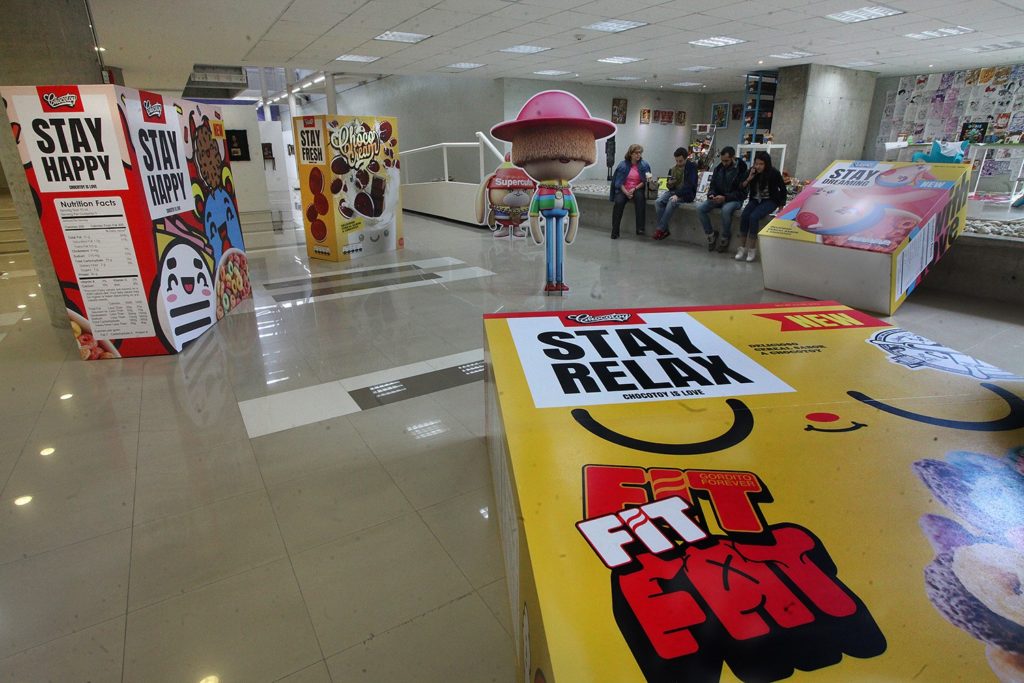 La exposición «Supercomercial», del estudio de diseño venezolano Chocotoy, se apropió del Centro Cultural UCAB, con piezas llamativas de distinto formato que siguen la estética japonesa Kawaii y la californiana Lowbrow, ambas caracterizadas por los colores vivos, figuras de gran dimensión y el uso de elementos cercanos a la cultura popular contemporánea (desde lo publicitario a lo musical o televisivo).