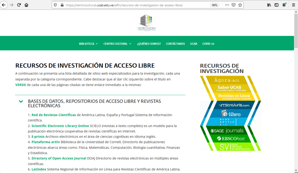 Con el fin de apoyar a docentes y alumnos en medio del contexto de aislamiento por la COVID-19, el Centro Cultural de la Universidad Católica Andrés Bello realizó una restructuración de la página web, https://biblioteca.ucab.edu.ve/, para poner a disposición del público un catálogo de recursos que pueden ser consultados, en línea, antes de prepararse para hacer trabajos, estudiar para un examen, cumplir con alguna tarea, elaborar un ensayo o desarrollar un proyecto de investigación.