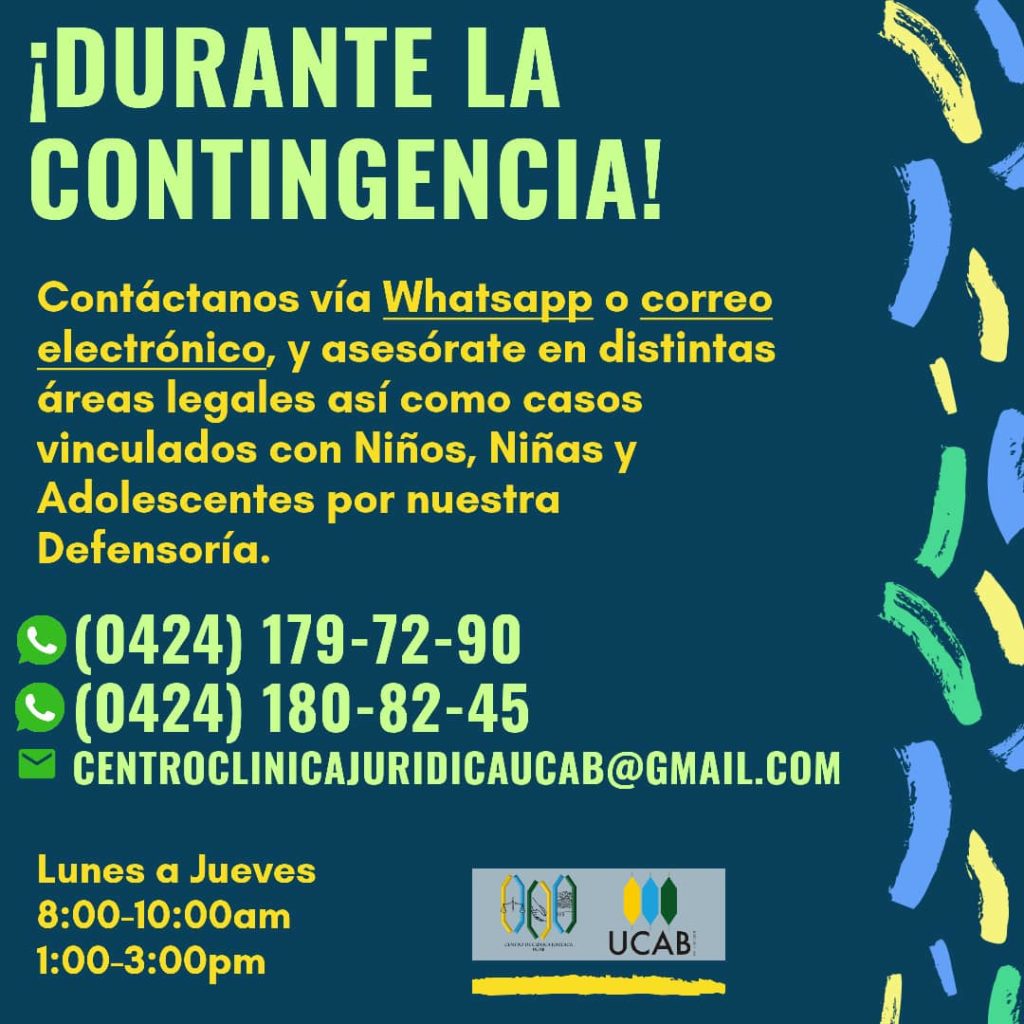 El Centro de Clínica Jurídica de la Universidad Católica Andrés Bello ha reactivado sus conocidos servicios de asesoría legal gratuita, ahora mediante la aplicación telefónica WhatsApp así como a través de su dirección de correo electrónico, mientras se prolongue el período de distanciamiento social por el COVID-19 y esté en vigencia el decreto de estado de alarma que restringe las actividades presenciales de la Extensión Social.