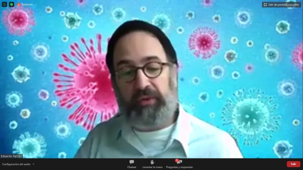 Eduardo Perozo explicó con gran detalle la fisiología celular de los virus, cómo operan y se hospedan en seres vivos –“el genoma del virus cambia con el tiempo, pierde o adquiere características que le permiten saltar a diferentes hospedadores” –, donde mutan y se replican en millones de copias y siguen una cadena que puede alcanzar al humano, como ha sido el caso del coronavirus COVID-19.