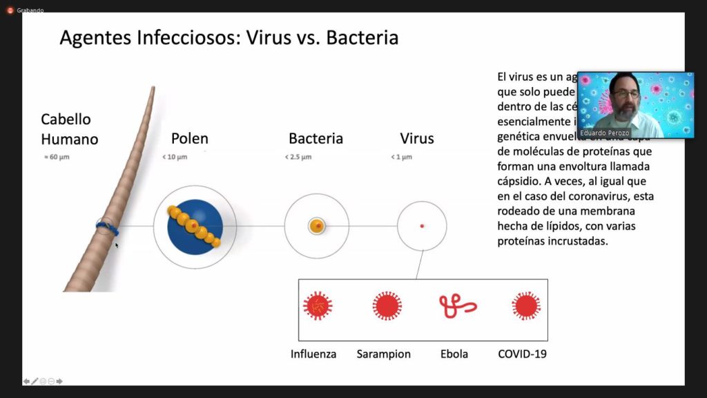 El biofísico ofreció detalles con gráficos sobre partes del virus que operan como “llaves” para entrar a las células sanas y en un proceso de “coevolución” con el hospedador, la enfermedad toma control. Precisó que estos detalles apenas hace menos de tres meses han podido ser analizado a nivel atómico con la más alta tecnología.