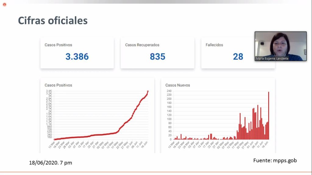 “Una de las intervenciones más importantes que tenemos que hacer para tratar de evitar que ese pico nos sobrepase es la capacidad de atención a los pacientes, que ya nos está costando a pesar de que no son muchos. Debemos proveer las medidas preventivas, sobre todo educando a la gente. Todavía el venezolano no está educado para prevenir la infección con el distanciamiento social mayor a un metro, higiene de manos, desinfección de áreas y saber qué nos sirve y desactiva al virus: etanol (alcohol etílico), peróxido de hidrógeno (agua oxigenada) hipoclorito de sodio (cloro o lejía) y jabón corriente. Hay que limpiar las superficies y mantener la mascarilla puesta”, dijo la infectólogo Landaeta.