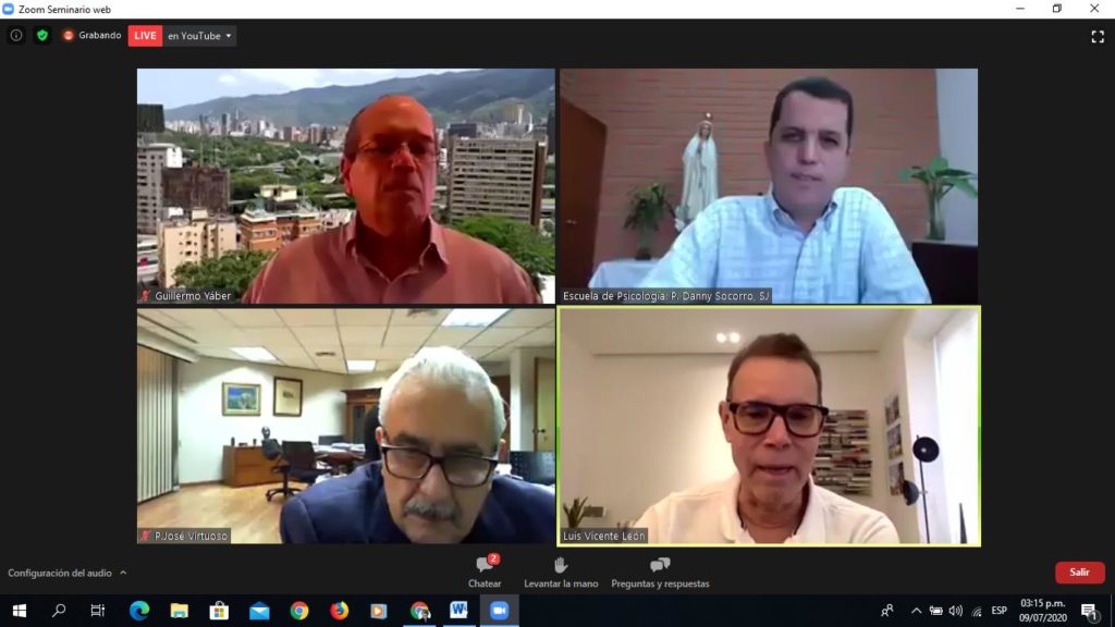 La Dirección de la Escuela de Psicología de la UCAB continuó este jueves 9 de julio con su ciclo de conferencias sobre los efectos de la COVID-19 y abordó esta vez el tema Pandemia y crisis económica ¿vivir o sobrevivir?, con la participación del rector Francisco José Virtuoso, s.j., el director del Centro de Innovación, Investigación y Desarrollo Académico de la UCAB (CIIDEA), Guillermo Yáber, y el economista Luis Vicente León, presidente de la encuestadora Datanalisis.