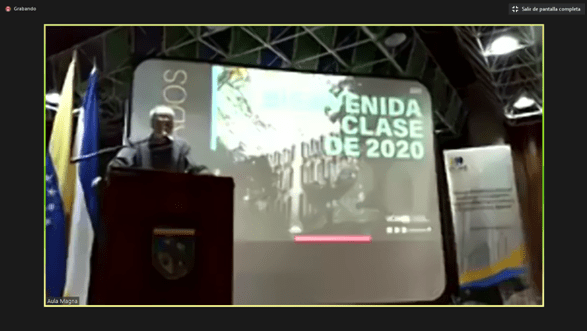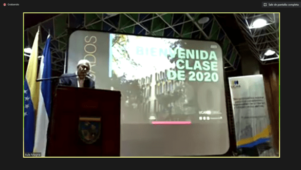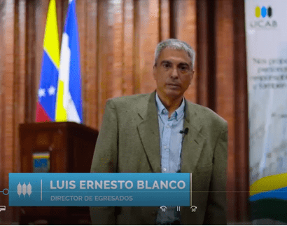 Seguidamente, el director de Egresados UCAB, Luis Ernesto Blanco, ofreció unas palabras de bienvenida, desde el Aula Magna de la universidad en Montalbán. El profesor celebró el esfuerzo de los estudiantes y señaló la responsabilidad que esta nueva etapa de sus vidas supone para ellos y el país.