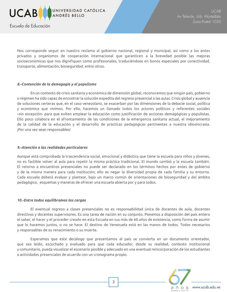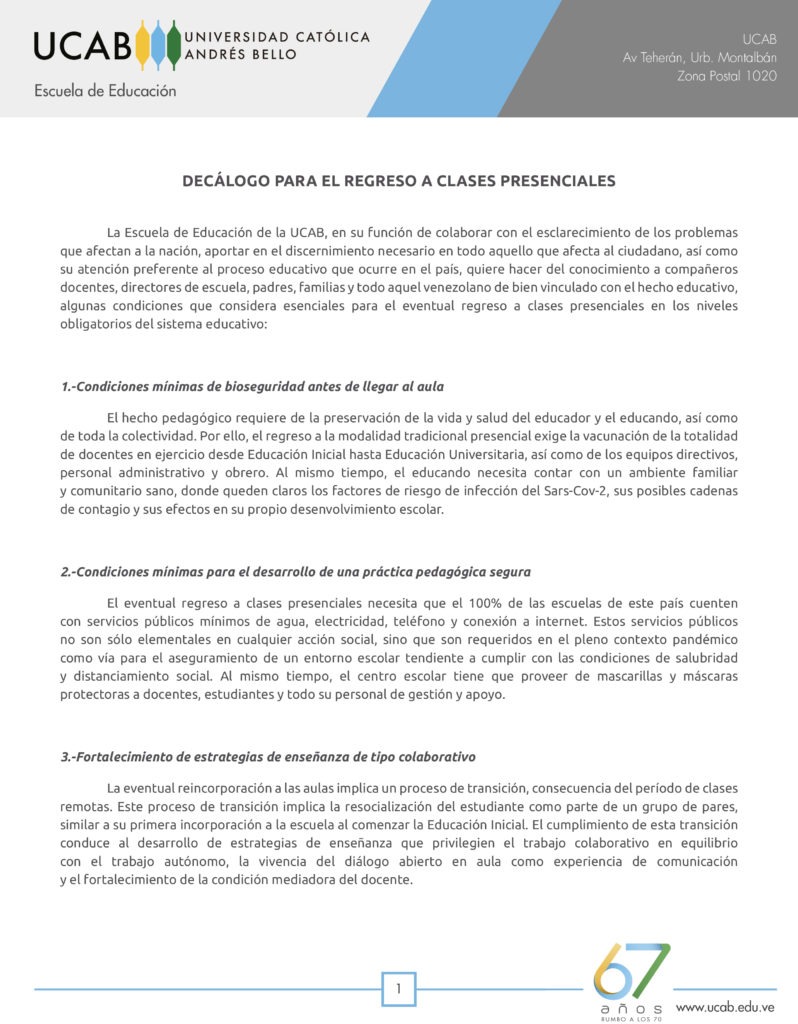 El Decálogo para el regreso a clases presenciales de la Escuela de Educación de la UCAB puede ser leído en su totalidad a continuación. También está disponible para su descarga haciendo clic en el siguiente enlace: