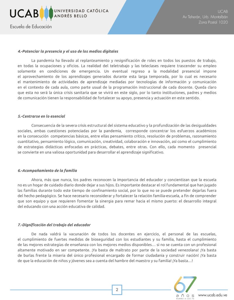 Dada la «profundización de las desigualdades sociales» en el acceso a la educación, como consecuencia de la «severa crisis estructural del sistema educativo» y la pandemia, la dependencia ucabista llamó a concentrar los esfuerzos pedagógicos en el reforzamiento de contenidos como «pensamiento crítico, resolución de problemas, razonamiento cuantitativo, pensamiento lógico, comunicación, creatividad, colaboración e innovación»,