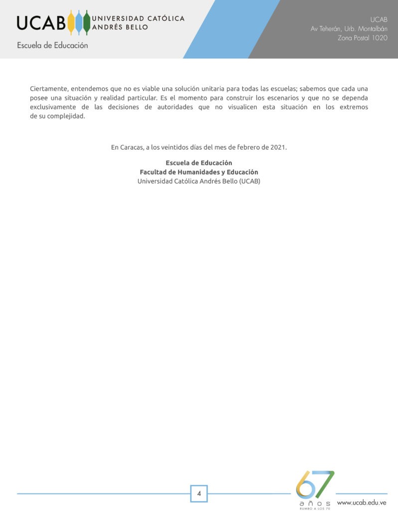 «El hecho pedagógico requiere de la preservación de la vida y salud del educador y el educando, así como de toda la colectividad. Por ello, el regreso a la modalidad tradicional presencial exige la vacunación de la totalidad de docentes en ejercicio desde Educación Inicial hasta Educación Universitaria, así como de los equipos directivos, personal administrativo y obrero. Al mismo tiempo, el educando necesita contar con un ambiente familiar y comunitario sano, donde queden claros los factores de riesgo de infección del Sars-Cov-2, sus posibles cadenas de contagio y sus efectos en su propio desenvolvimiento escolar», se lee en el documento de la Escuela de Educación.