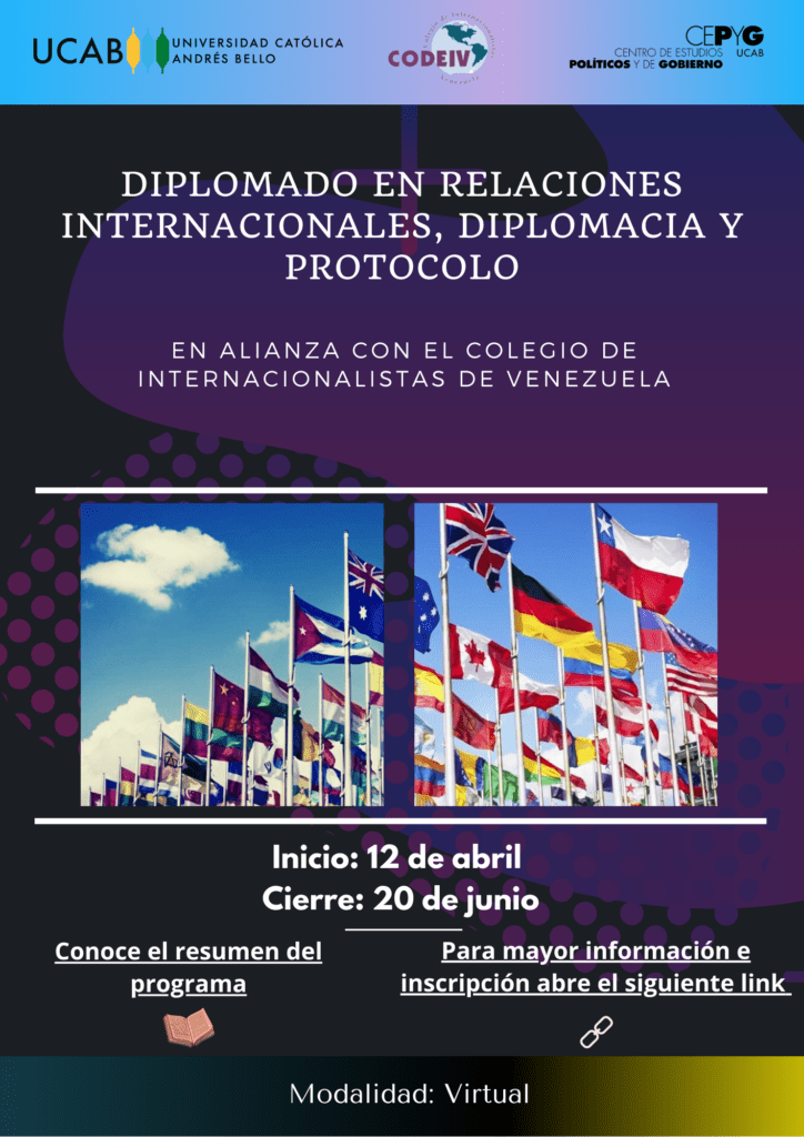 También a partir del 12 de abril y hasta el 20 de junio, el CEPyG UCAB dictará, en alianza con el Colegio de Internacionalistas de Venezuela, la segunda edición del Diplomado en Relaciones Internacionales, Diplomacia y Protocolo.
