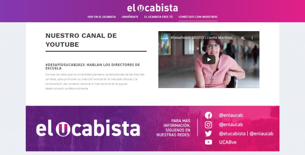 - «Nuestro canal de Youtube», conexión directa al canal de videos de la universidad, UCABve.