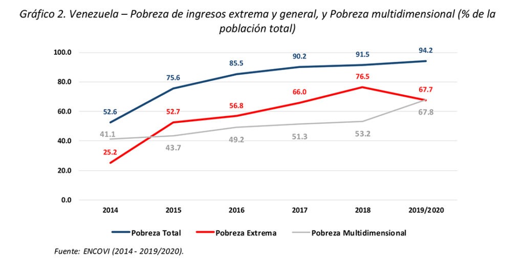 «Estos procesos, junto con los de la hiperinflación y dolarización, han dado lugar a una mayor inequidad en la distribución del ingreso y a un crecimiento dramático de la pobreza de ingresos y de la pobreza multidimensional», las cuales se ubican en 94% y 67%, respectivamente. «La mayor desigualdad en la distribución del ingreso se revela en el sensible aumento del coeficiente de Gini de 0,407 a 0,495 entre 2014 y 2019/202010, valores que permiten calificar a Venezuela como uno de los países más desiguales en la región latinoamericana que, incluso, destaca por ser la más desigual del mundo».
