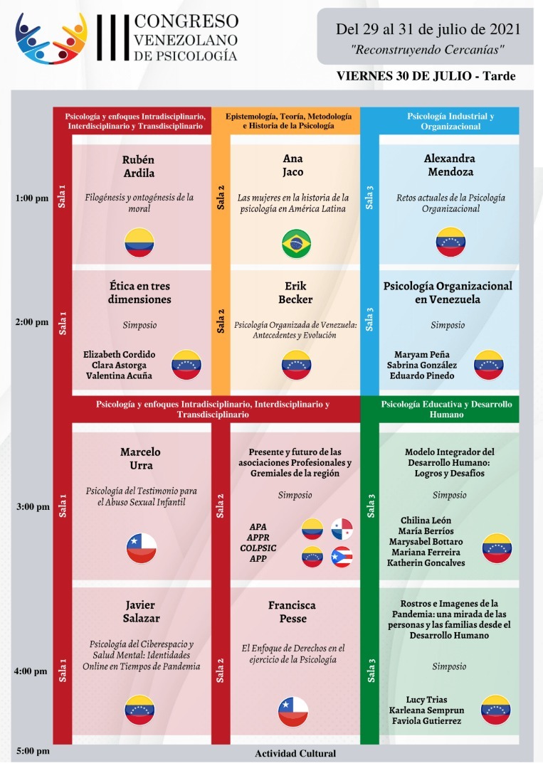 Teresa Torres, Aminta Parra, Ángel Oropeza, Juan Canga y Johnny Gavlosky. Además participarán el vicerrector académico de la UCAB, Gustavo Peña; Claudia Caycedo, decana de la Facultad de Psicología de la Fundación Universitaria Konrad Lorenz (Colombia); Juan Felipe Cardona, profesor asociado de la Facultad de Psicología de la Universidad del Valle (Argentina); Alicia Neuburger, psicóloga argentina con experiencia en trauma psicosocial; Raúl Alelú Paz, psicólogo español experto en gestión de equipos y resolución de conflictos; Marcelo Urra, editor de la Revista Chilena de Posracionalismo; y Ana Jacó, docente e investigadora de la Universidade do Estado do Rio de Janeiro (Brasil).