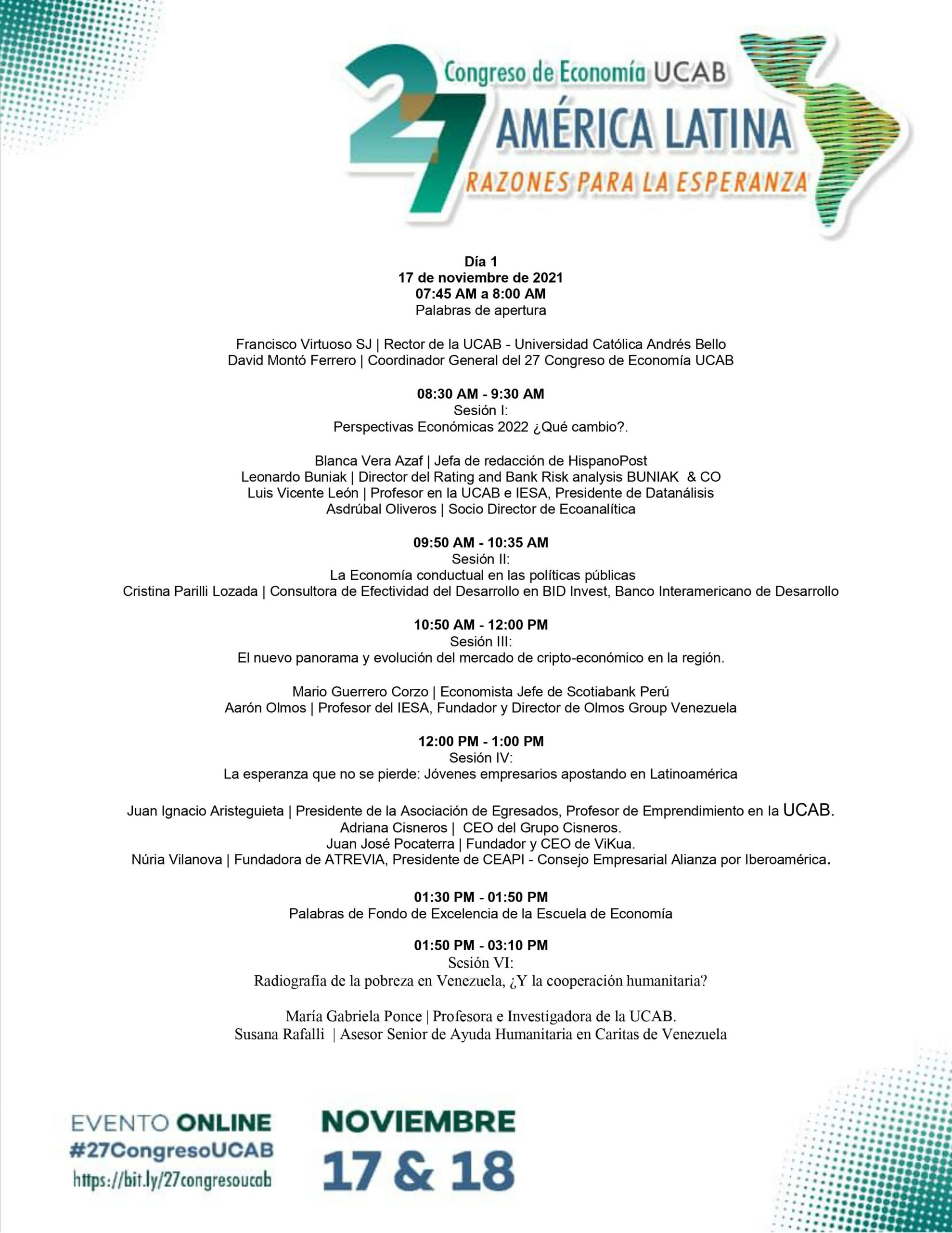 El evento forma parte de las actividades de la Semana del Economista 2021, organizada por la Escuela de Economía de la UCAB, la cual se estará realizando del lunes 15 al viernes 19 de noviembre.