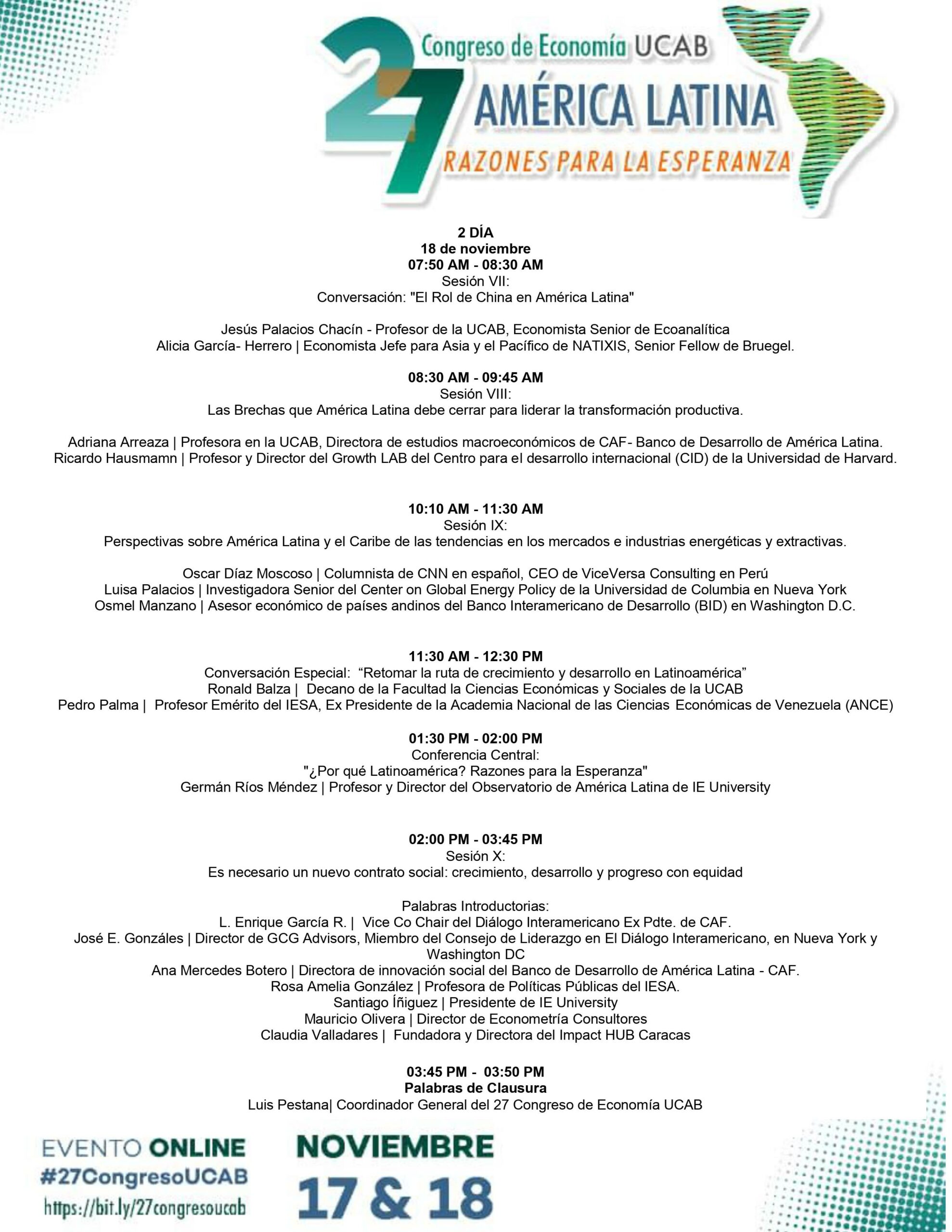 Con el nombre “América Latina. Razones para la esperanza”, la actividad contempla 10 paneles de discusión, distribuidos en las dos jornadas de trabajo, en los cuales se abordarán, entre otros temas, las perspectivas económicas de Venezuela para 2022, la economía conductual en las políticas públicas, el mercado cripto-económico en la región, la situación de la pobreza en Venezuela y la ayuda humanitaria, el rol de China en Latinoamérica, las perspectivas de la industria energética y extractivista en el continente, la apuesta de jóvenes empresarios por el desarrollo del país y las brechas que América Latina debe cerrar para liderar la transformación productiva.