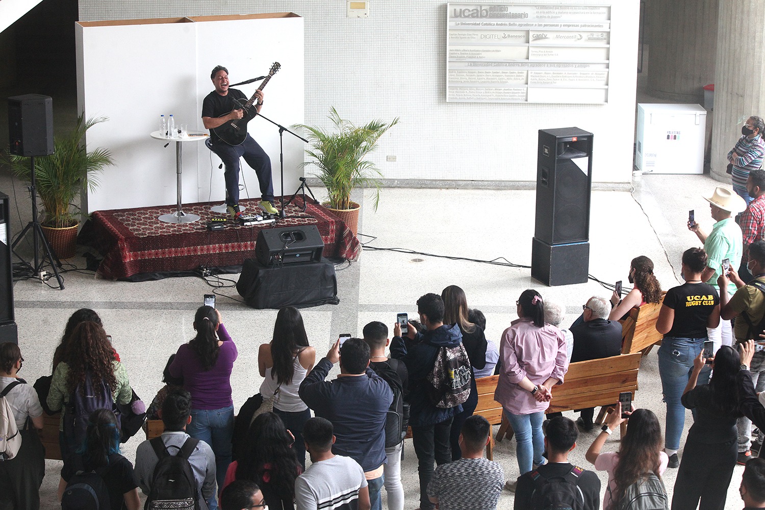 El día culminó con “Horacio Blanco y su desorden musical y literario”, una presentación íntima, en el edificio Cincuentenario, en la que el vocalista de la banda Desorden Público entonó varios de sus éxitos, acompañado por un grupo de estudiantes, trabajadores e invitados de la UCAB que corearon y aplaudieron su participación.