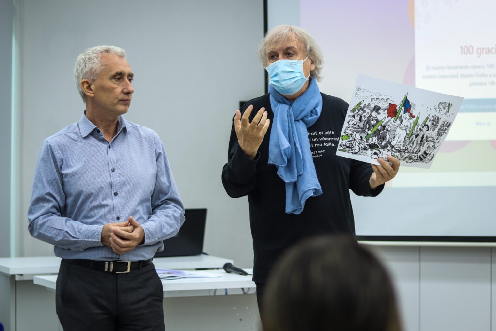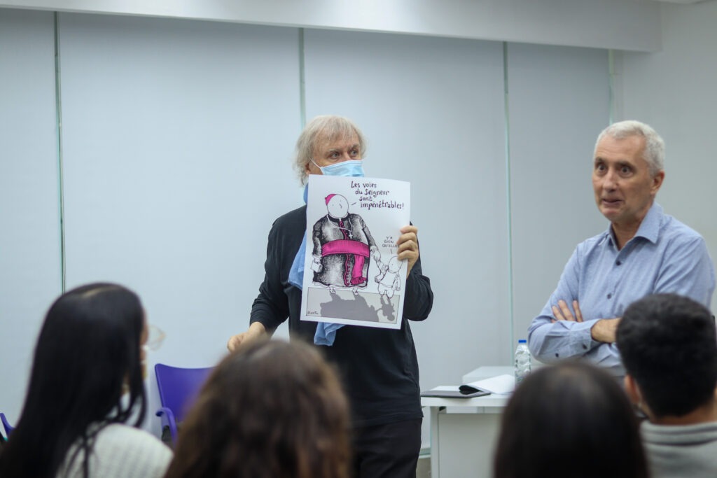 El dibujante de 71 años -quien hasta su jubilación, en marzo de 2022, publicaba sus viñetas en el periódico Le Monde de París- fue el protagonista de una tertulia y sesión de preguntas con alumnos de la Escuela de Comunicación Social de la casa de estudios, con quienes compartió su experiencia personal y laboral en la creación, la publicación y el efecto mediático de sus caricaturas.