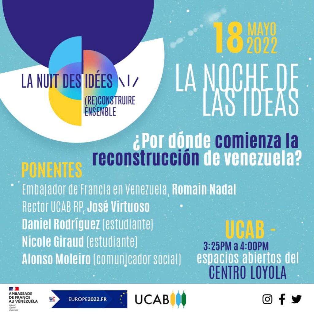 La última conversación de la jornada, titulada “¿Por dónde comienza la reconstrucción de Venezuela?”, está prevista a las 3:25 pm y en ella se compartirán criterios para reinstitucionalizar el país e impulsar su desarrollo social y económico, a partir del rescate del patrimonio y la infraestructura, pero también a partir de experiencias de emprendimiento, organización, cooperación e inclusión social. El rector de la UCAB, Francisco José Virtuoso, y el embajador de Francia, Romain Nadal, conducirán esta tertulia; estarán acompañados por el periodista y analista político, Alonso Moleiro, y por los jóvenes Nicole Giraud y Daniel Rodríguez, representante estudiantil ante el Consejo Académico de la UNIMET y presidente del Centro de Estudiantes de Ingeniería de la UCAB, respectivamente.