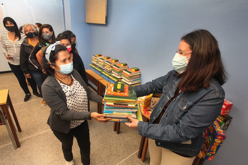 La entrega se llevó a cabo en el Parque Social Manuel Aguirre de la UCAB, en Montalbán, al cierre de un taller en el que más de 20 maestras, líderes comunitarias y madres escucharon la charla de la docente Grisell Arellano, quien profundizó en cómo activar la creatividad en los estudiantes a la vez que se construyen espacios de socialización adecuados y se cuida el material entregado, especialmente los libros.