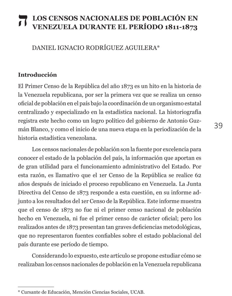 Para este ucabista, ser publicado en el selecto boletín fue inesperado, pues los trabajos incluidos suelen ser de académicos y especialistas. De hecho, en el volumen de la ANH en el que aparece hay trabajos de Inés Quintero, Germán Carrera Damas, Elías Pino Iturrieta, Diego Bautista Urbaneja, el padre Luis Ugalde, Tomás Straka y María Elena González Deluca. La investigación de Rodríguez estudió a profundidad cómo se realizaban los censos en Venezuela antes de 1873, cuando el presidente Antonio Guzmán Blanco realizó el primer estudio poblacional.