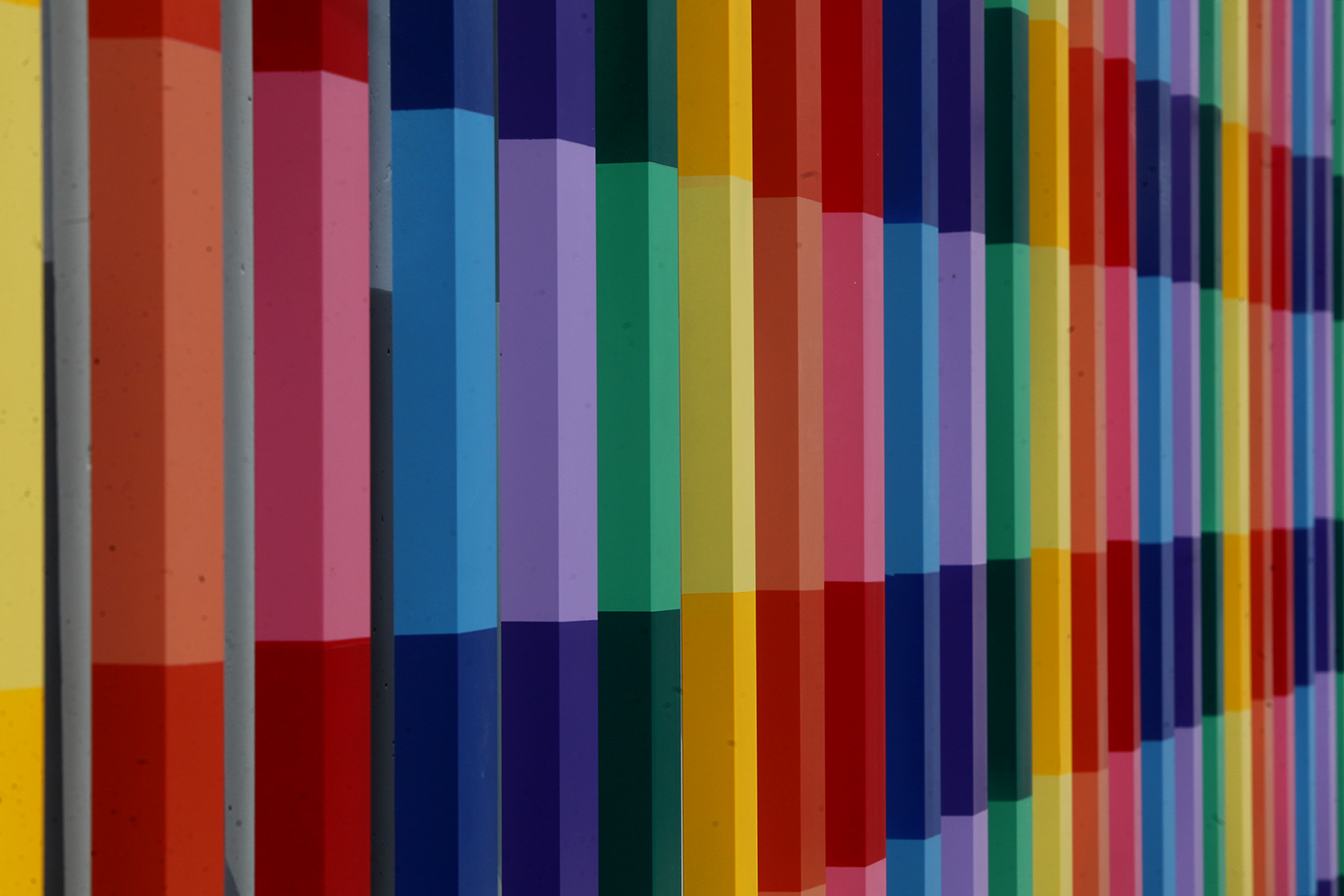 La obra, dividida en dos partes, está compuesta por los colores rojo, naranja, amarillo, verde, azul y morado en diferentes tonalidades.