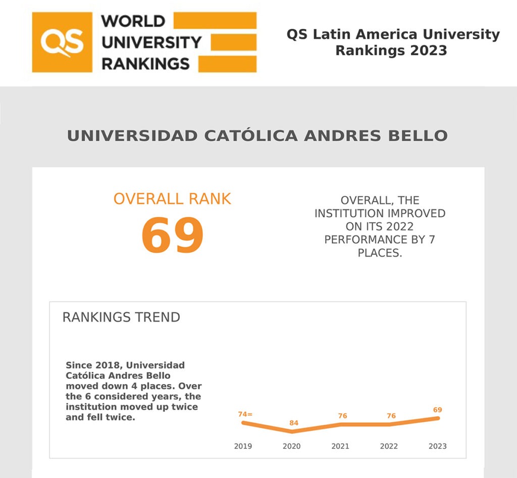 Ya en el QS World University Rankings 2023, publicado en junio y dedicado a ponderar el desempeño de universidades de todo el planeta, la UCAB ascendió al menos 50 lugares a nivel mundial y se posicionó en el rango 751-800 entre casi 1.500 universidades evaluadas. En 2022 se ubicó en el rango 800-1000.