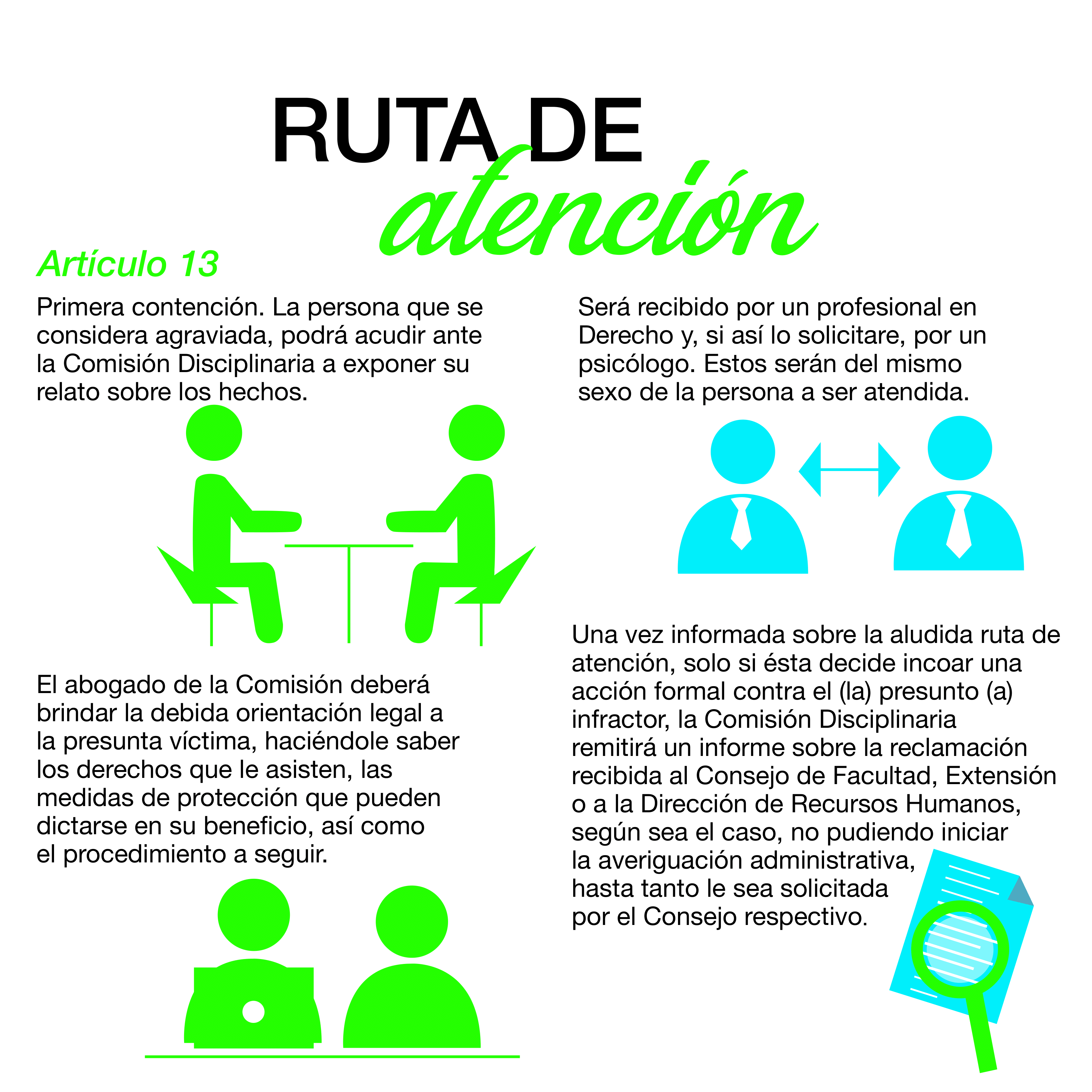 De acuerdo con la secretaria de la UCAB, uno de los grandes logros de la activación del protocolo es la existencia de una ruta de atención clara a las posibles víctimas. Por ello señaló la necesidad de que las personas que se sientan agraviadas, o consideren que han sido víctimas de acoso o violencia, acudan ante la Comisión Disciplinaria, donde recibirán asesoría e incluso protección y apoyo psicológico, de ser el caso. Agregó que también es posible que un tercero presente la denuncia, si así lo quisiera la víctima.