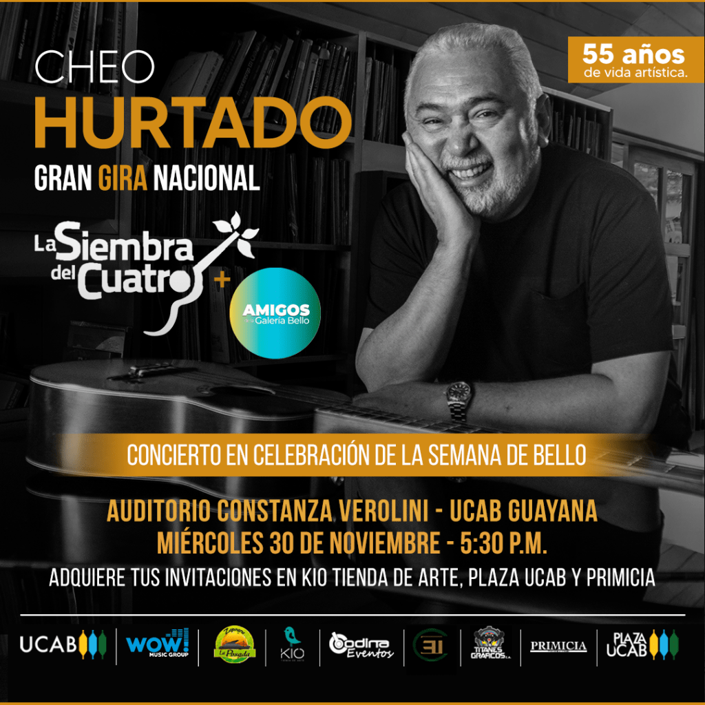 Ese miércoles cerrará con un concierto que forma parte de la gira nacional del maestro del cuatro Cheo Hurtado. Las entradas para este evento podrán ser adquiridas en la UCAB Guayana, Kío tienda de arte y en la sede del diario Primicia, en Alta Vista. Lo recaudado será profondos de los proyectos de la Galería Bello.