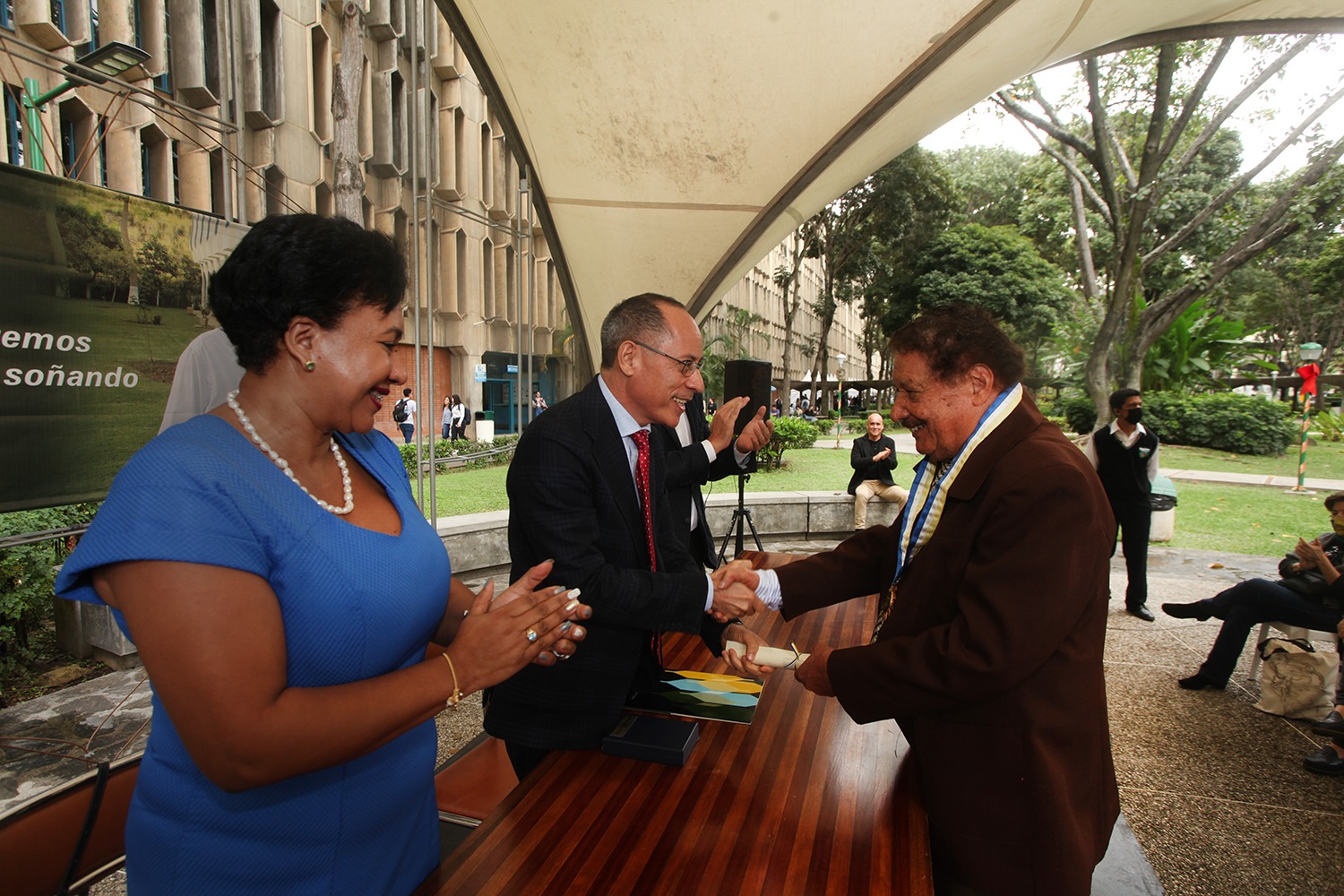 La acompañó en este reconocimiento Juvenal Ravelo (Caripito, 1934), artista plástico cuya constancia y disciplina han sido galardonadas con numerosos premios nacionales e internacionales y a quien la UCAB le debe contar con varias de sus piezas: dos murales ubicados en el edificio de Laboratorios, donde funciona la Facultad de Ingeniería, y su más reciente creación: un mural de 20 metros de largo que engalana una de las paredes del centro cultural de la universidad.