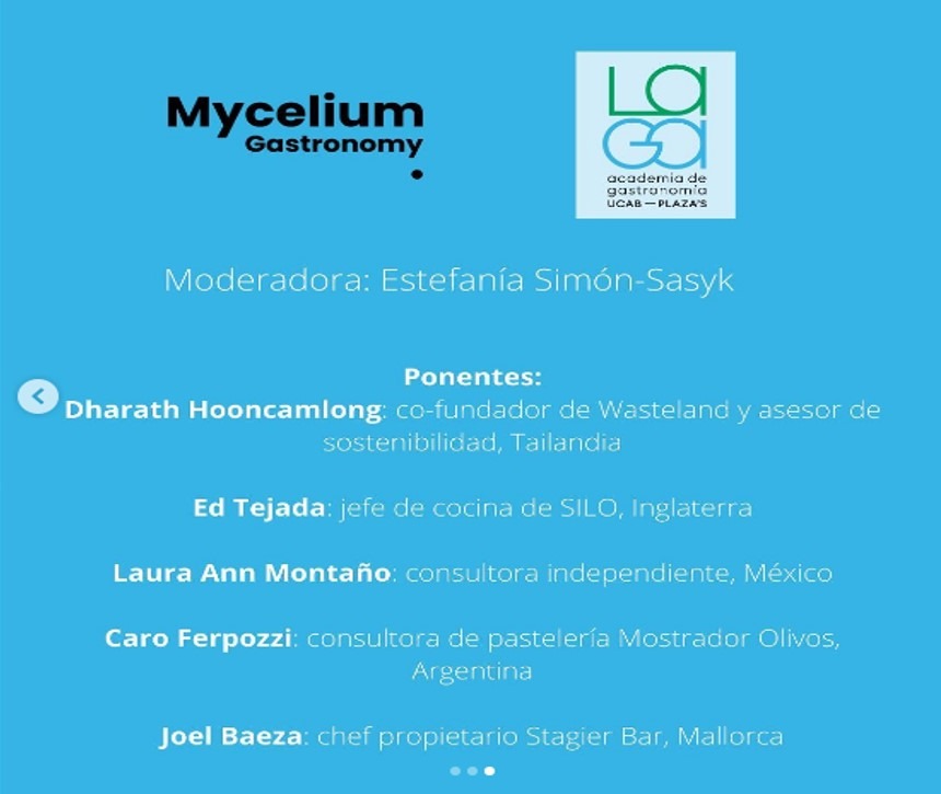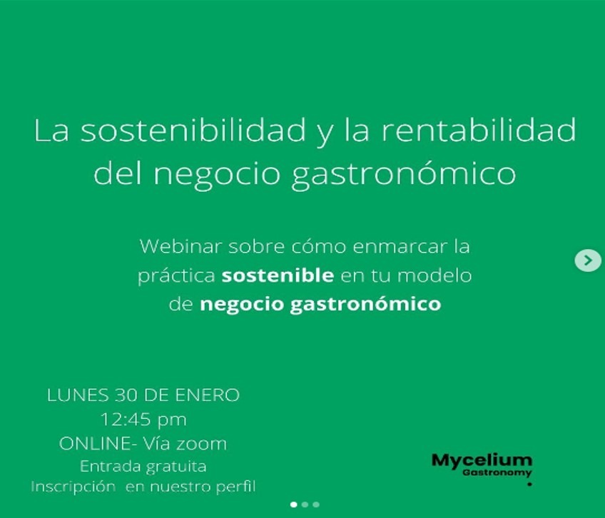 El lunes 30 de enero se estará realizando el encuentro virtual “La sostenibilidad y rentabilidad del negocio gastronómico”, a cargo del equipo de Mycelium, con sede en España. La actividad comenzará a las 10:00 am y en ella participarán expertos de varios países: Dharath Hooncamlong (Tailandia), Ed Tejada (Inglaterra), Laura Ann Montaño (México), Caro Ferpozzi, y Joel Baeza (España).