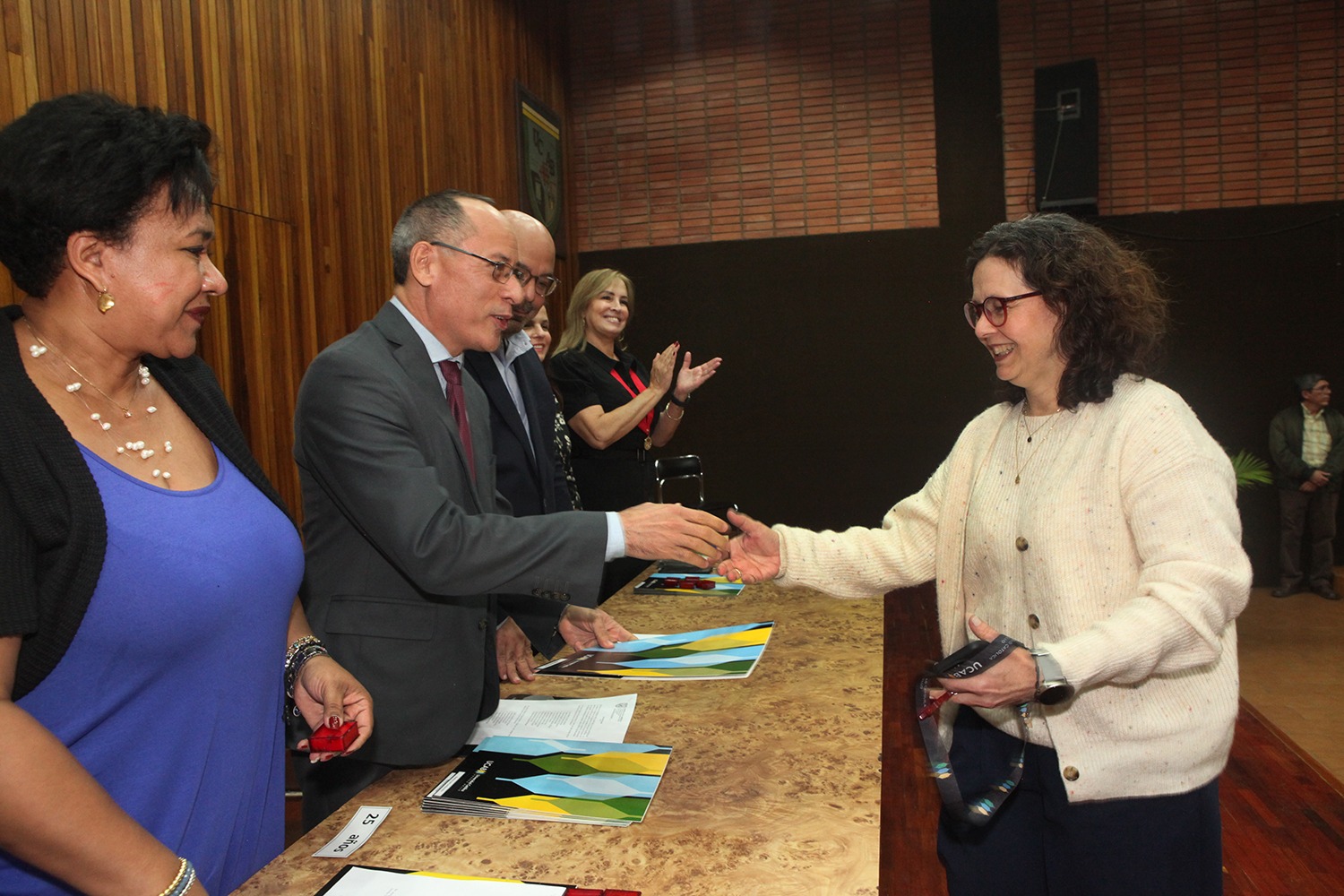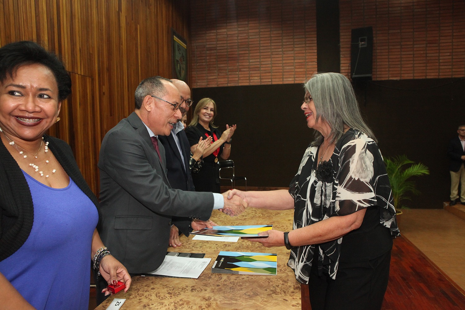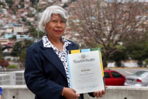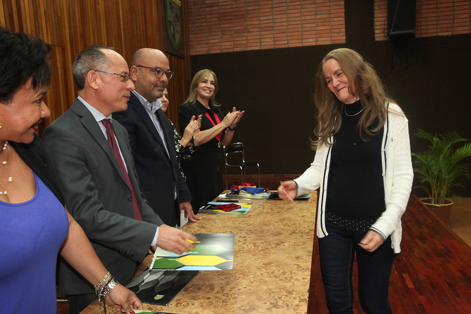 Nicolasa Martínez de Arcia recibió una condecoración por más de 30 años de servicio. «Desde que llegué he trabajado por el usuario. Pero para mí es muy emocionante porque la hemos pasado muy bien en Biblioteca Central, la biblioteca antigua y la biblioteca nueva. Y aquí vamos hacia adelante, pero siempre con un solo pensamiento: dar lo mejor de uno, que los demás aprendan y nosotros también aprender. Pero eso tiene qué ver con ser ucabista porque es estar comprometido con la universidad y también con el país; sacarlo adelante. Y creo que desde La Católica se hace eso exactamente», afirmó Martínez.