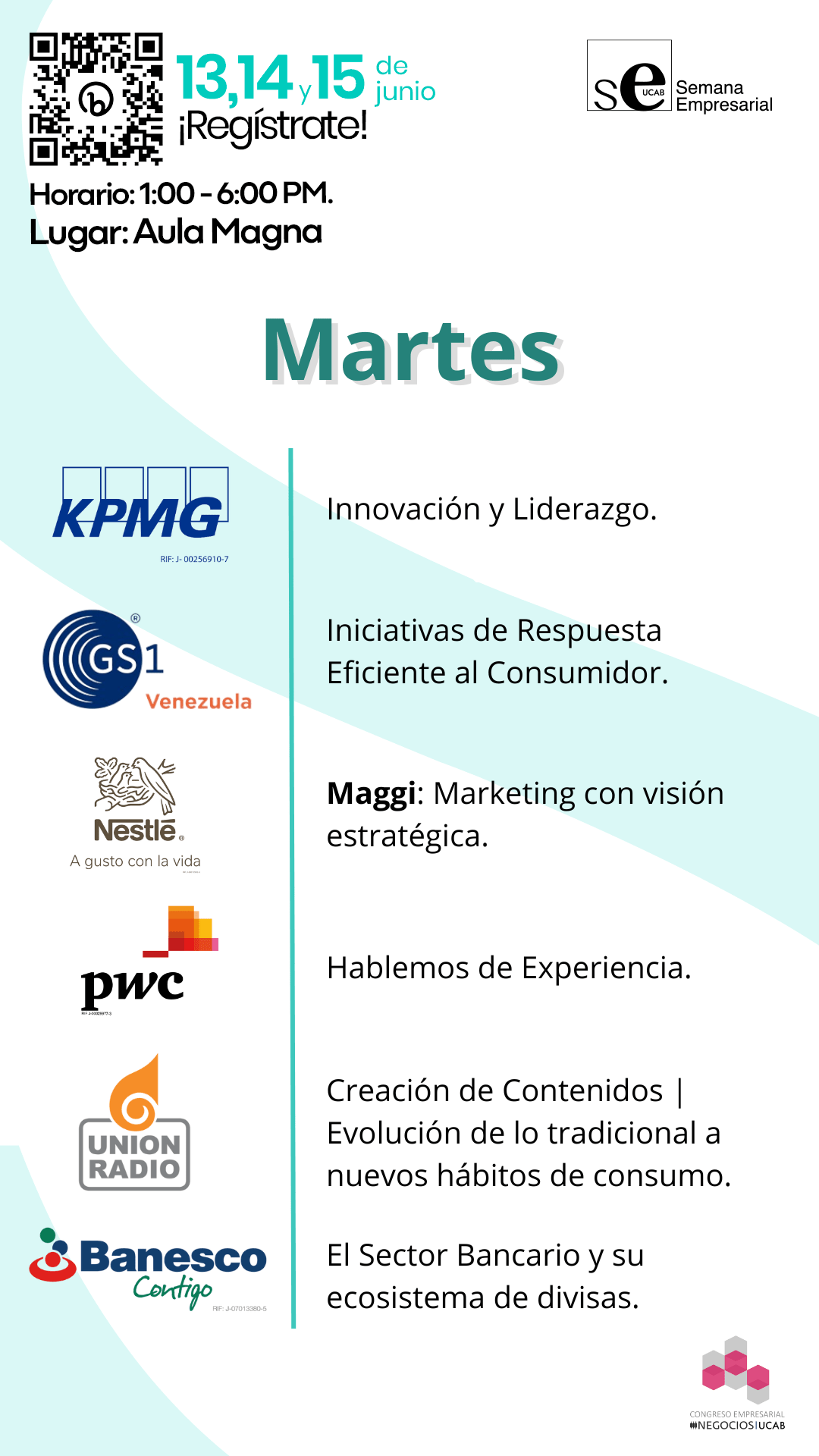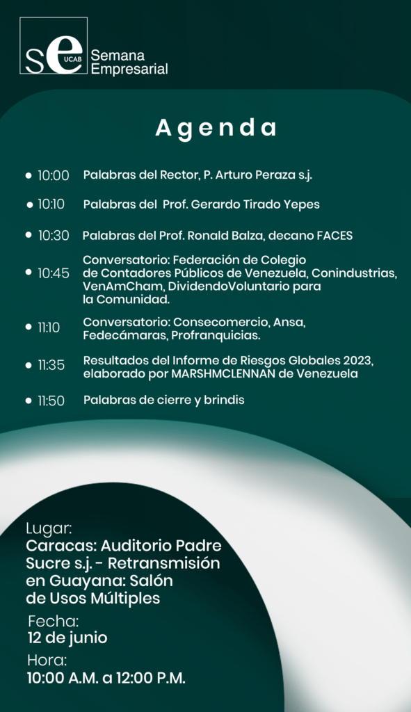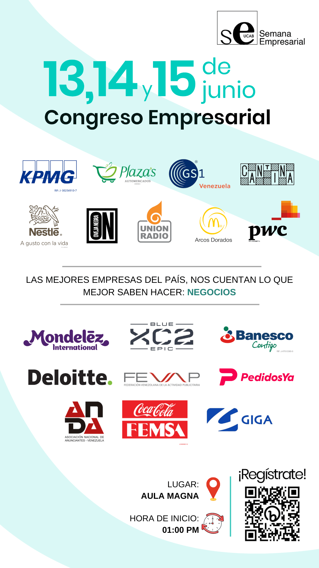 Un día después, el 13 de junio, se dará el pitazo inicial al Congreso Empresarial UCAB, en el cual se mostrará las estrategias y acciones que distintas marcas del país están emprendiendo para adaptarse al contexto socioeconómico actual y convertirse en muestras corporativas de resiliencia en ámbitos como el consumo masivo, la moda, la responsabilidad empresarial, la consultoría financiera, la gestión estratégica, la alimentación, el negocio de restaurantes, el retail, la publicidad y el mercadeo, la banca y la radiodifusión, entre otros.
