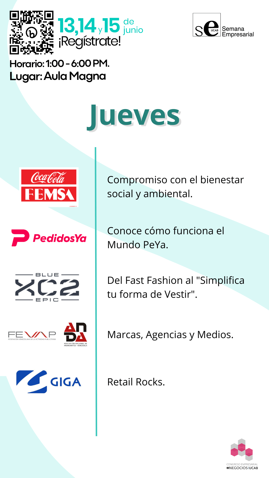La lista de ponentes incluye a ejecutivos y representantes de más de una veintena de organizaciones: Coca Cola-Femsa, Pedidos Ya, GS1, Fénix Media, Anda, Fevap, Mondelez, Arcos Dorados Venezuela, PWC, Unión Radio, Banesco, Nestlé, Giga Retail, Deloitte, KPMG, Cantina Cantina, Oveja Negra y Automercados Plaza´s. Este encuentro se llevará a cabo, hasta el 15 de junio, en el Aula Magna de Montalbán, de 1:00 a 5:00 p.m.