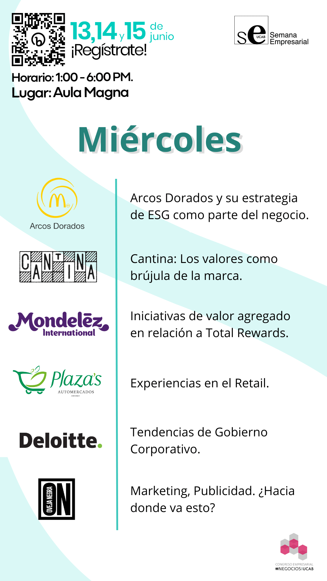 La Semana Empresarial UCAB 2023 continuará con el Congreso Empresarial, el cual tendrá lugar en el Aula Magna de la universidad, del martes 13 al jueves 15 de junio, y en el que más de una veintena de organizaciones dictaran conferencias sobre su gestión de negocios.