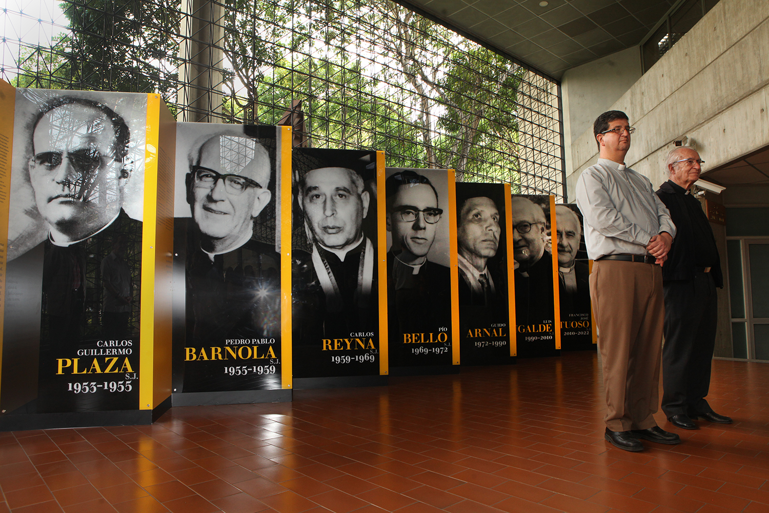 El conjunto de fotografías y biografías de los siete rectores se encuentra expuesto en la planta baja del edificio de Servicios Centrales del campus Montalbán y muestra a los protagonistas, de izquierda a derecha, en el orden de sus ejercicios: Carlos Guillermo Plaza, S.J. (1953-1955); Pedro Pablo Barnola, S.J. (1955-1959); Carlos Reyna, S.J. (1959-1969), Pío Bello, S.J. (1969-1972); el ingeniero Guido Arnal (1972-1990), Luis Ugalde, S.J. (1990-2010) y Francisco José Virtuoso, S.J. (2010-2022).