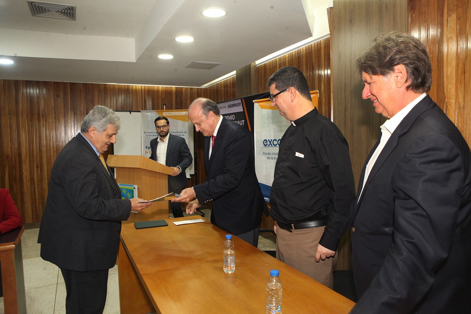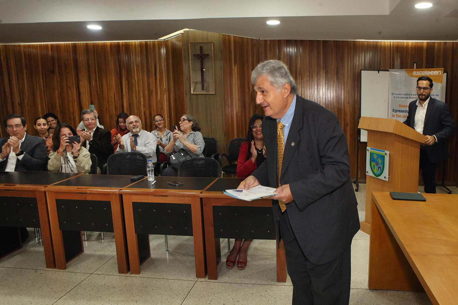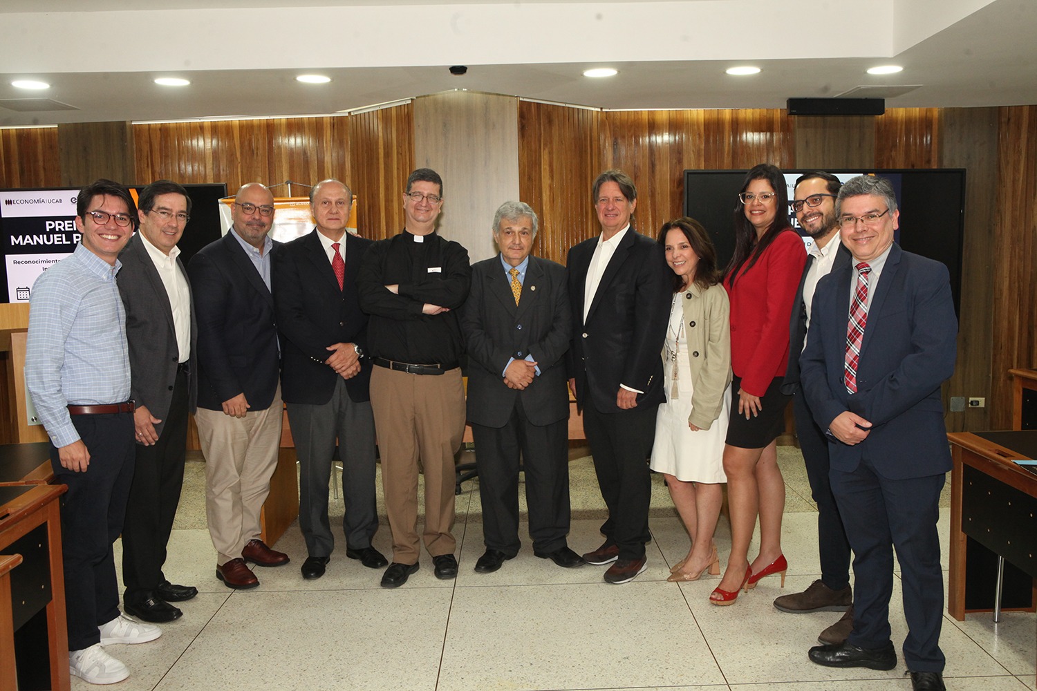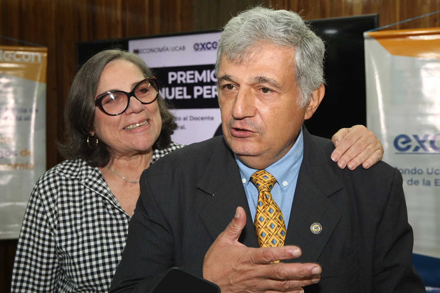 La ceremonia de premiación tuvo lugar el martes 11 de julio en la sala José Loreto Arismendi, en el campus Montalbán, y contó con la participación –además del homenajeado y su esposa- del rector de la institución, Arturo Peraza, S.J.; la directora de la Escuela de Economía, María Alejandra Paublini, así como del presidente y miembros de la junta directiva de Excelecon, asociación civil fundada en 2019 por economistas egresados de la universidad para procurar recursos financieros y humanos que contribuyan a que la UCAB mantenga la calidad formativa de los futuros profesionales de la economía.