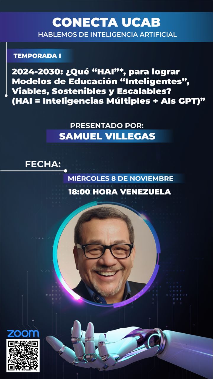 - Miércoles 08/11 – 6:00 pm: “2024-2030: ¿Qué “HAI”* para lograr modelos de educación inteligentes, viables, sostenibles y escalables? (HAI=Inteligencias Múltiples + AIs GPT)”. Dictado por Samuel Villegas. Organizado en alianza con la AUSJAL.