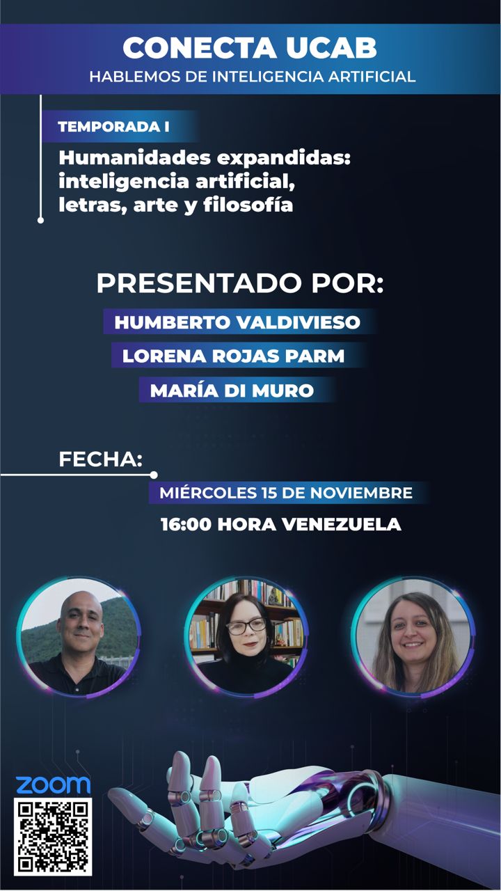 - Miércoles 15/11 – 4:00 pm: “Humanidades expandidas: inteligencia artificial, letras, arte y filosofía”. Conducido por los profesores Humberto Valdivieso, Lorena Rojas y María Di Muro.