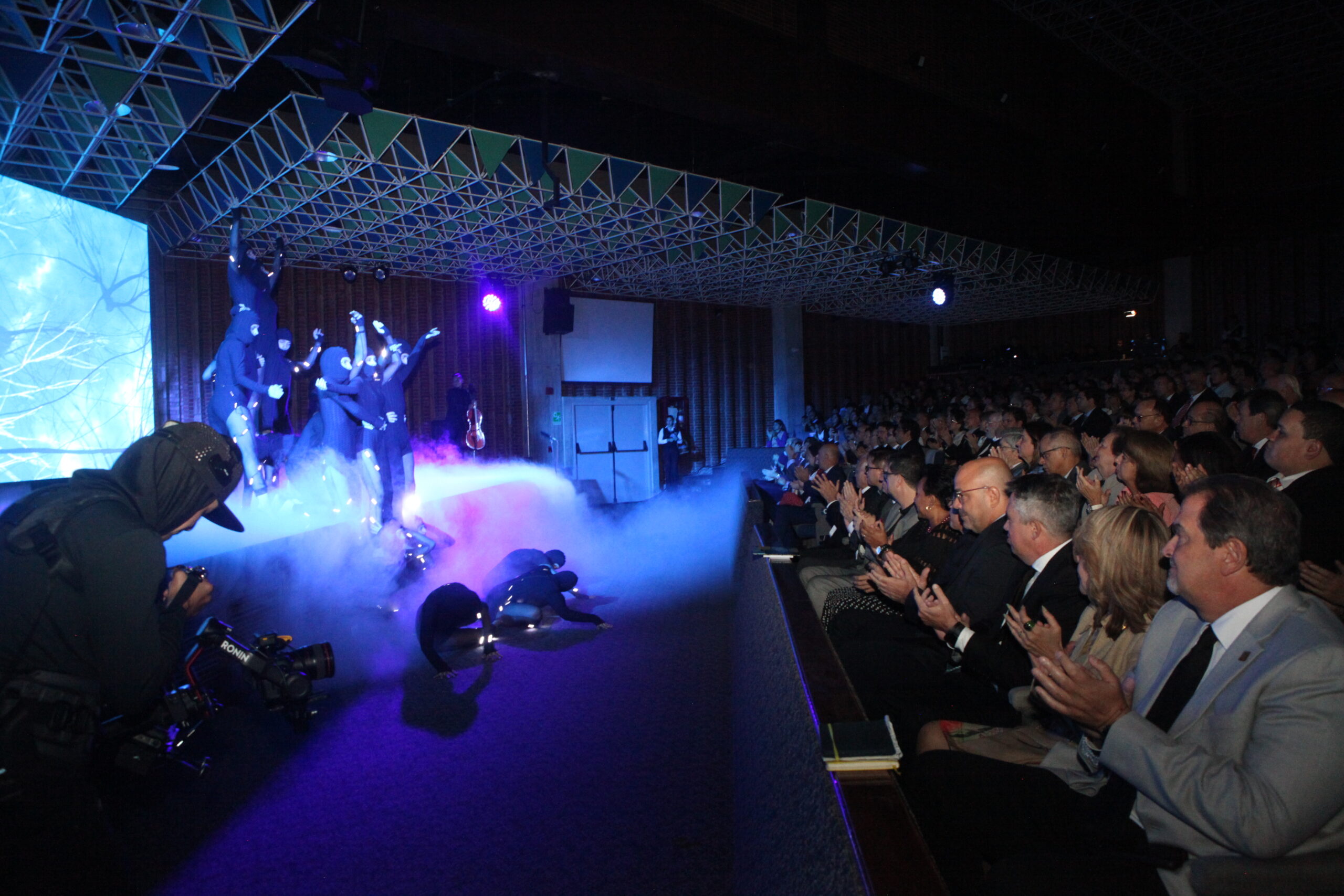 Tras la proyección del video, integrantes de Teatro UCAB, acompañados por un ensamble instrumental del Sistema de Orquestas, realizaron una emotiva actuación en la que, al compás del Oboe de Gabriel, pieza emblemática del compositor italiano Ennio Morricone, se convirtieron en raíces y ramas de un árbol que crece fuerte y listo para dar sus frutos. El vestuario de esta presentación fue creado por la Academia de Moda UCAB y la iluminación diseñada por el profesor de la Facultad de Ingeniería, Manuel Peña.