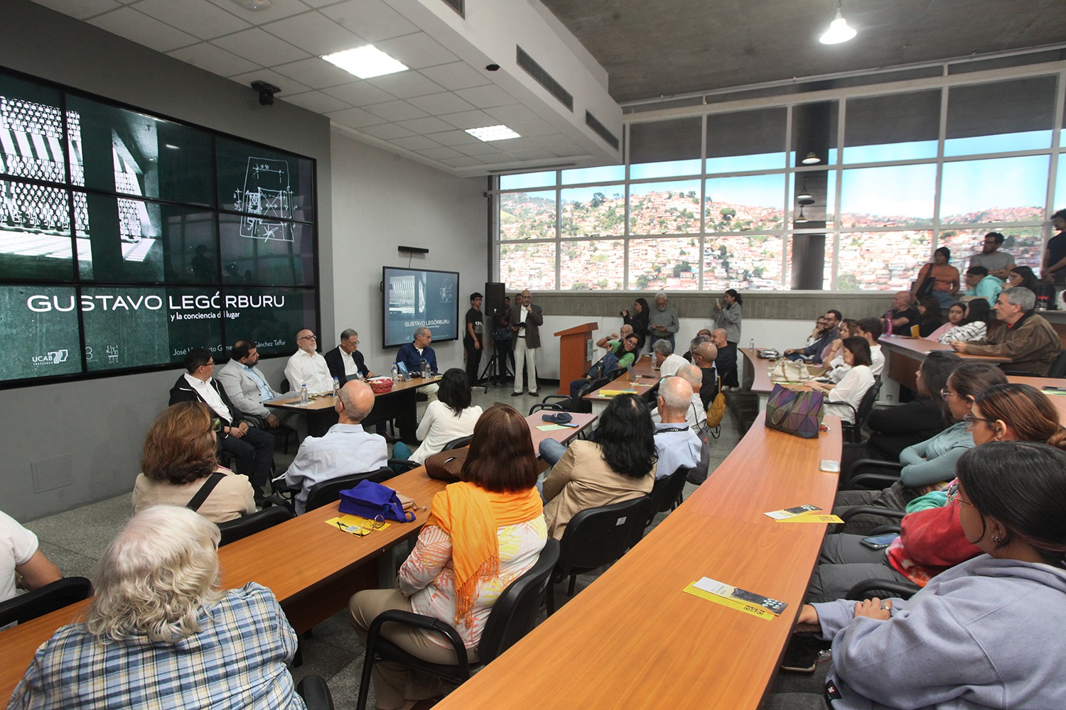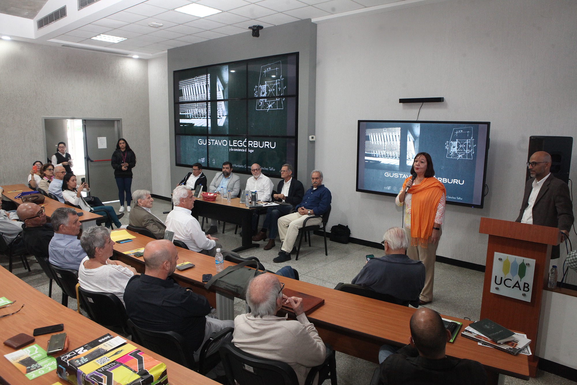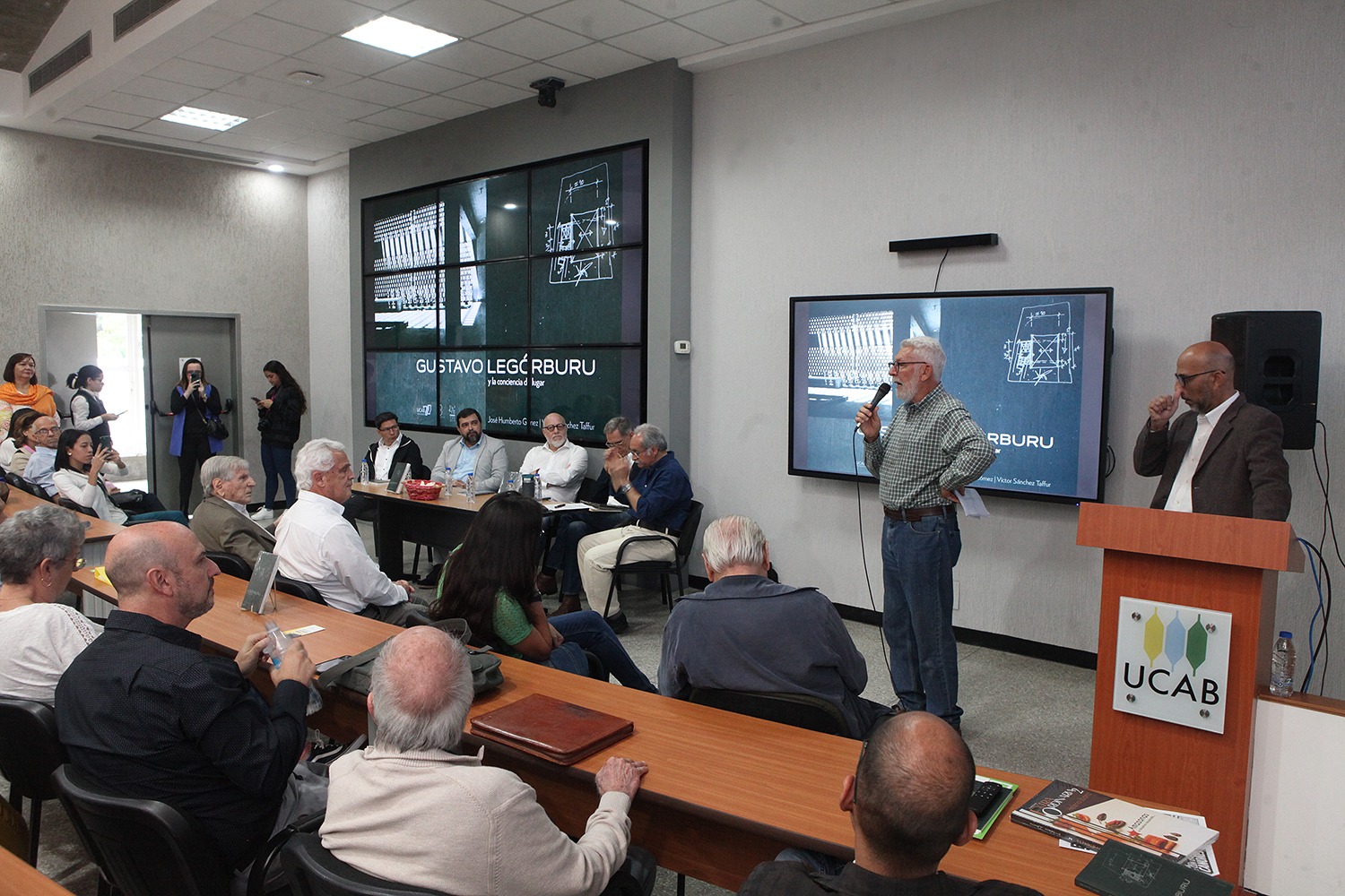 El pasado jueves 30 de noviembre, representantes de la Escuela de Arquitectura de la UCAB, junto con autoridades de la Facultad de Ingeniería, bautizaron el primer libro de su colección Premios Nacionales de Arquitectura. Se trata de Gustavo Legórburu y la conciencia del lugar, escrito por el director de la escuela, José Humberto Gómez, y el jefe de la Cátedra de Diseño de esa dependencia, el profesor Víctor Sánchez Taffur.