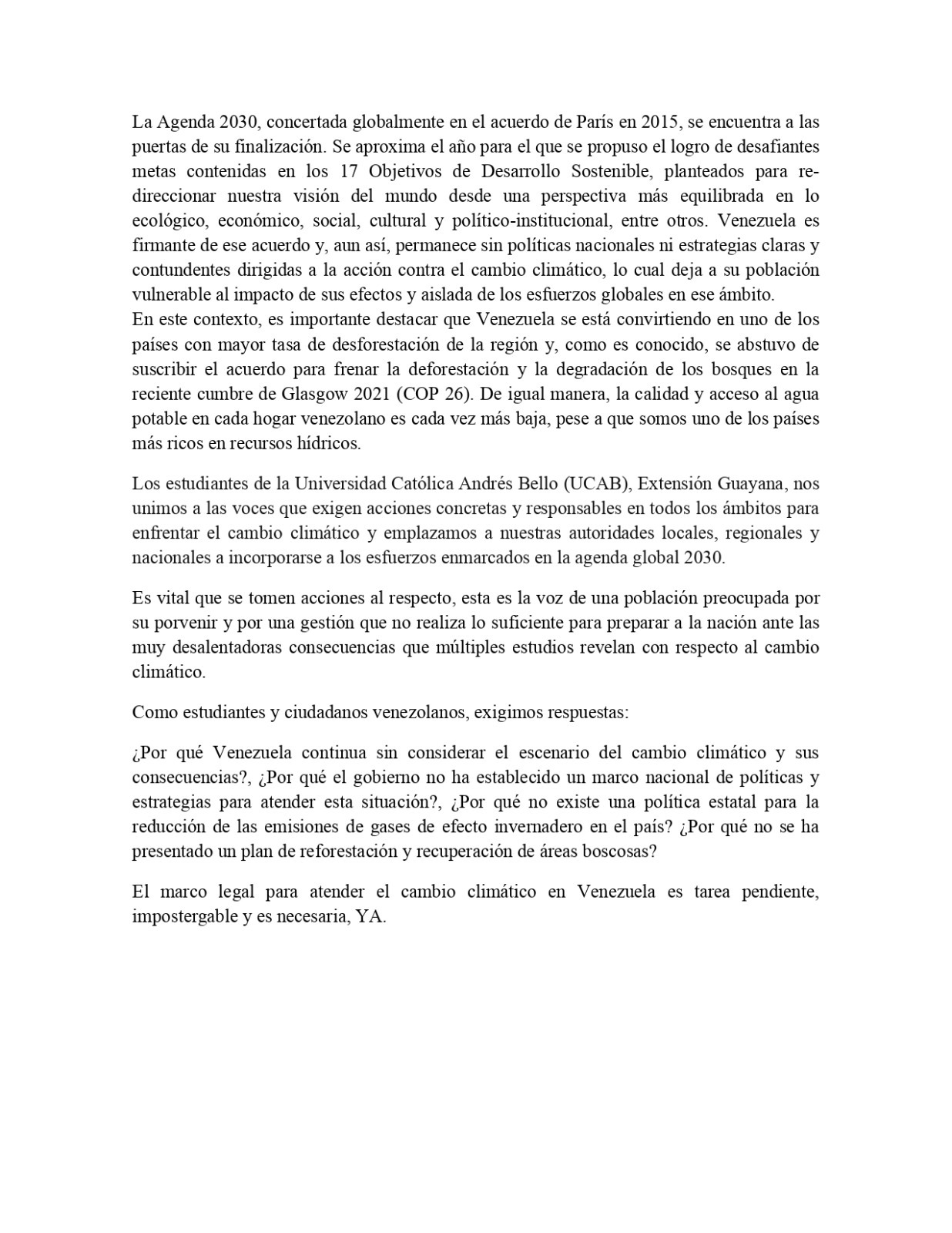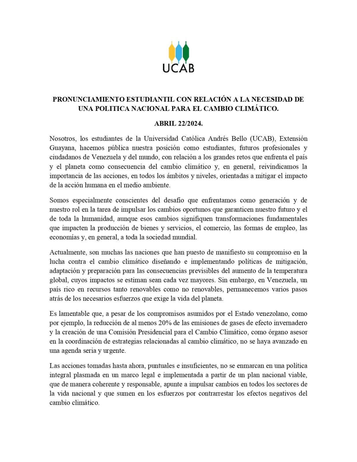 Miembros de la representación estudiantil de la Universidad Católica Andrés Bello, extensión Guayana (UCAB Guayana), emitieron un pronunciamiento sobre la necesidad de una política pública nacional para enfrentar el cambio climático en Venezuela.