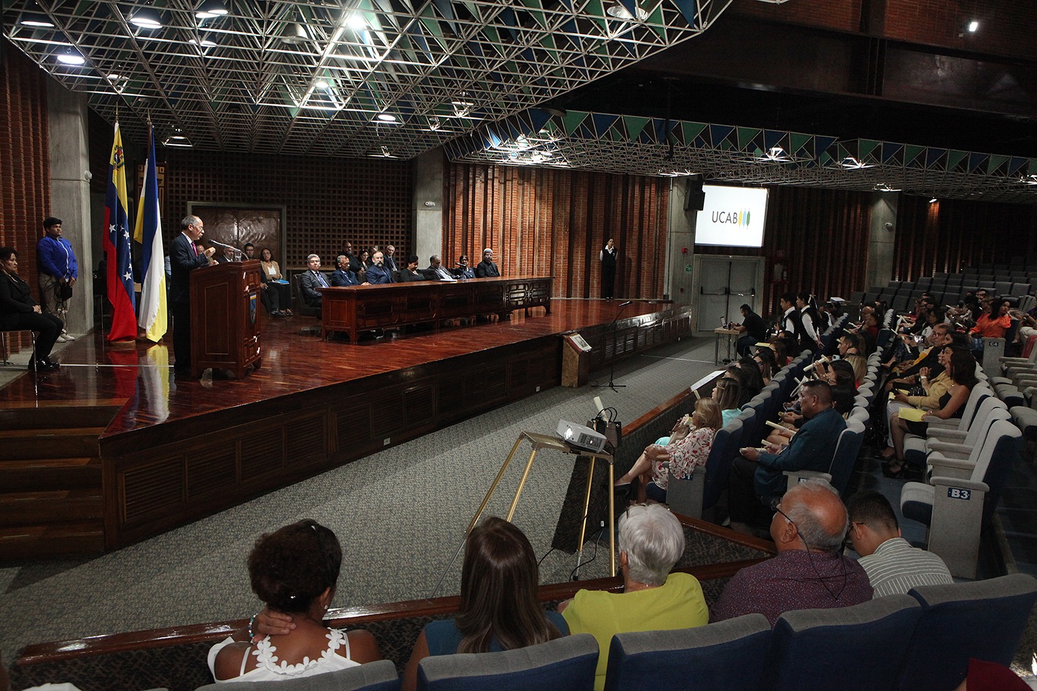 José Francisco Juárez, vicerrector académico, presidió el acto y destacó «el compromiso y la preocupación de la UCAB por insertarse en la realidad y tratar de darle la respuesta más efectiva, tratar de que la formación esté en un plano de innovación, que sus egresados den la respuesta más certera a las necesidades que tenemos».