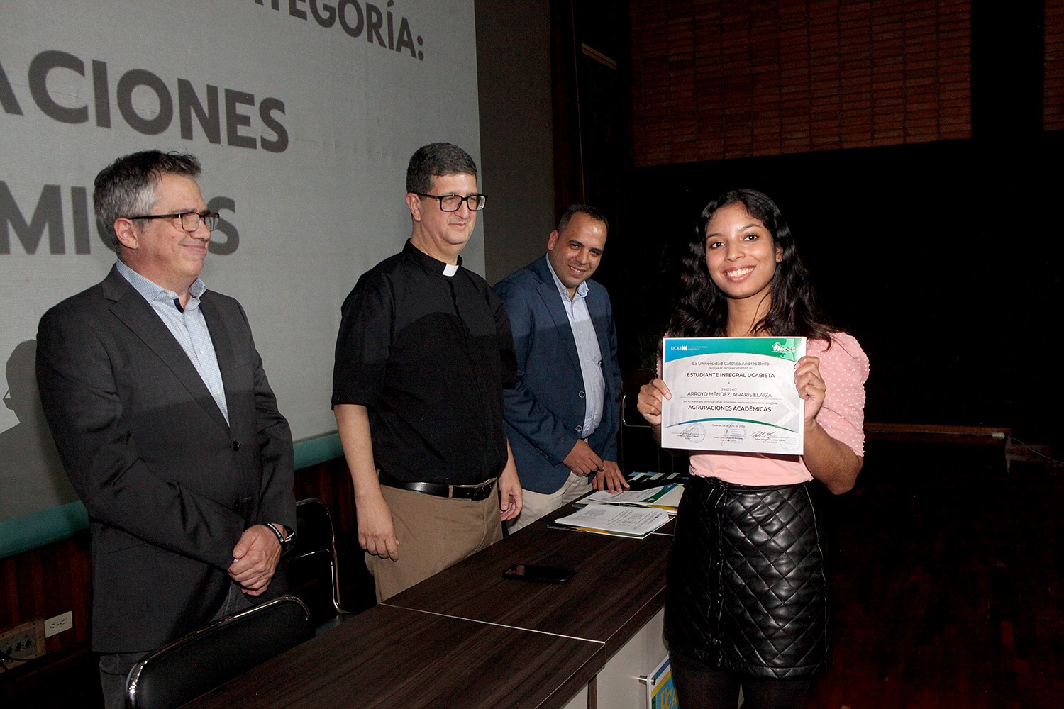 Arantxa Jurado -estudiante de Derecho en la UCAB- fue reconocida por su participación en la Representación estudiantil y Modelos y competencias. Y fue ella la encargada de ofrecer unas palabras a sus compañeros.