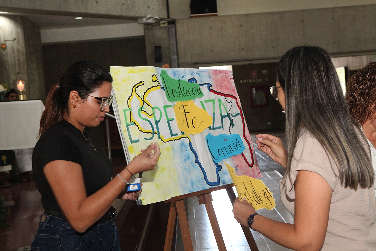 Los participantes en el oficio desgranaron sus deseos de «comunión, solidaridad, resiliencia, fraternidad, justicia y bien común» sobre un mapa de Venezuela que mostró en el centro la palabra «esperanza«, para significar uno de los objetivos primordiales de esta casa de estudios, próxima a celebrar 71 años de fundada.