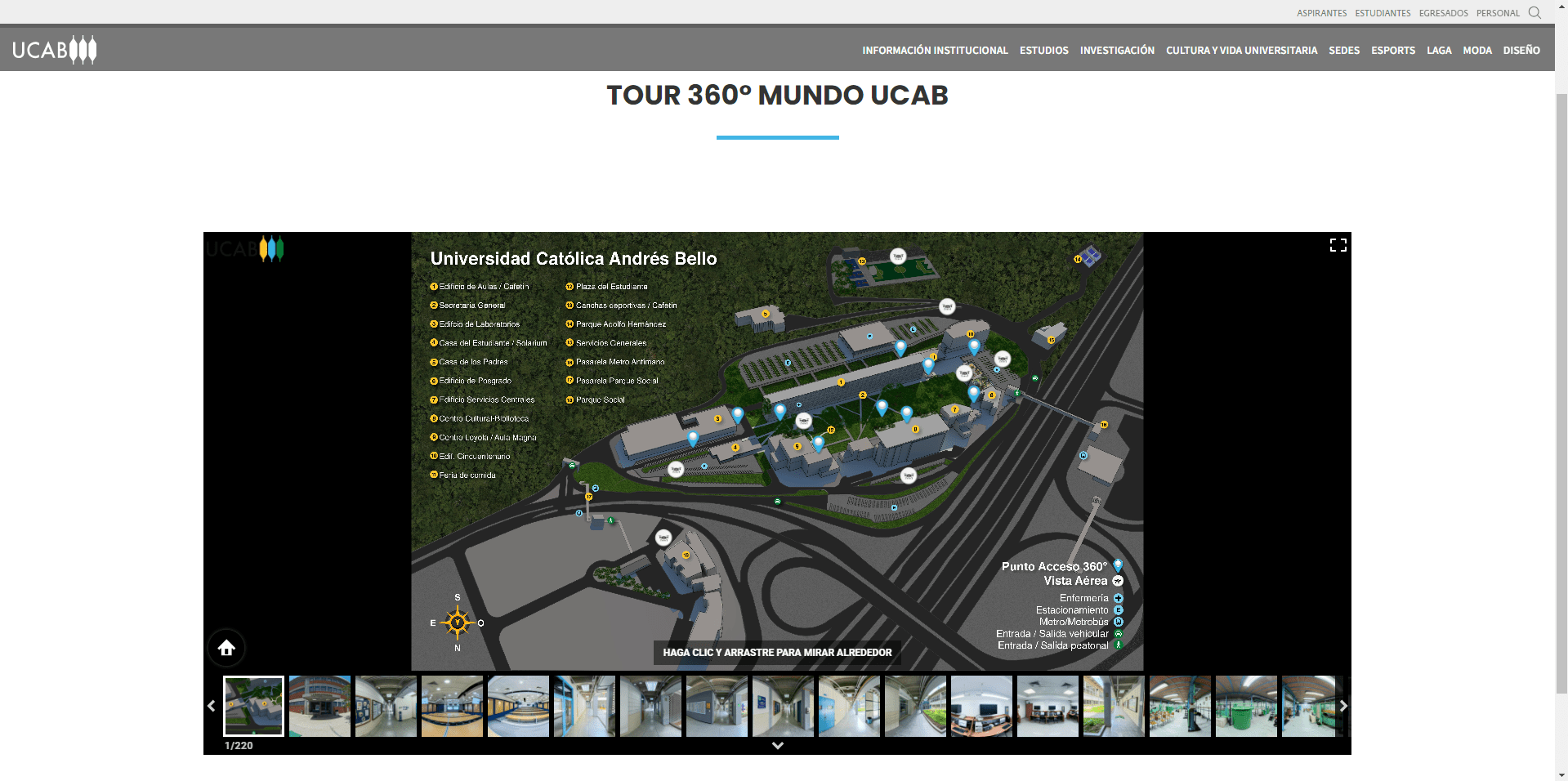 Disponible haciendo clic en www.ucab.edu.ve/tour-360-mundo-ucab, el proyecto interactivo digital nació desde el Vicerrectorado Administrativo de la universidad y fue posible gracias a una alianza con la productora Circus.