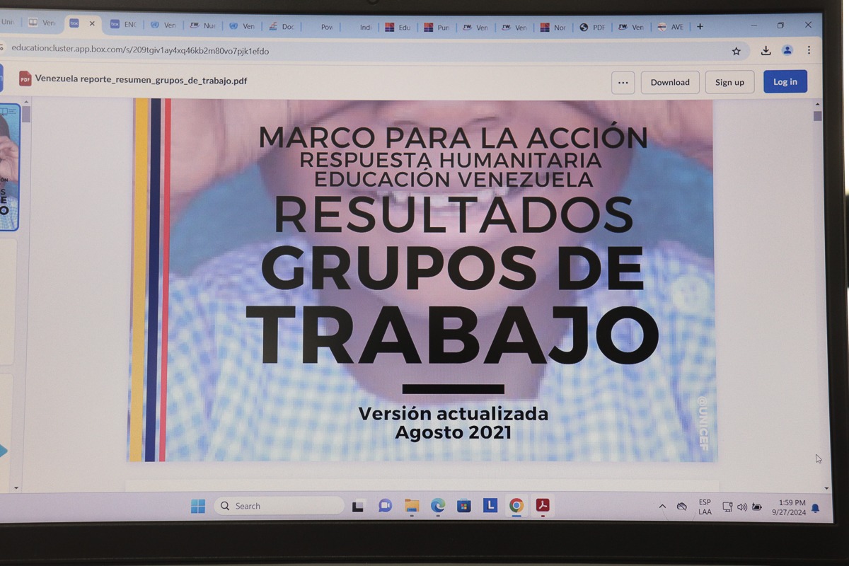 Uno de ellos fue el «Marco para la acción: Respuesta humanitaria educación Venezuela- Resultados grupos de trabajo«, donde participaron los profesores Eduardo Cantera (CIED UCAB), Edgar García (de la AVEC) y ella misma.